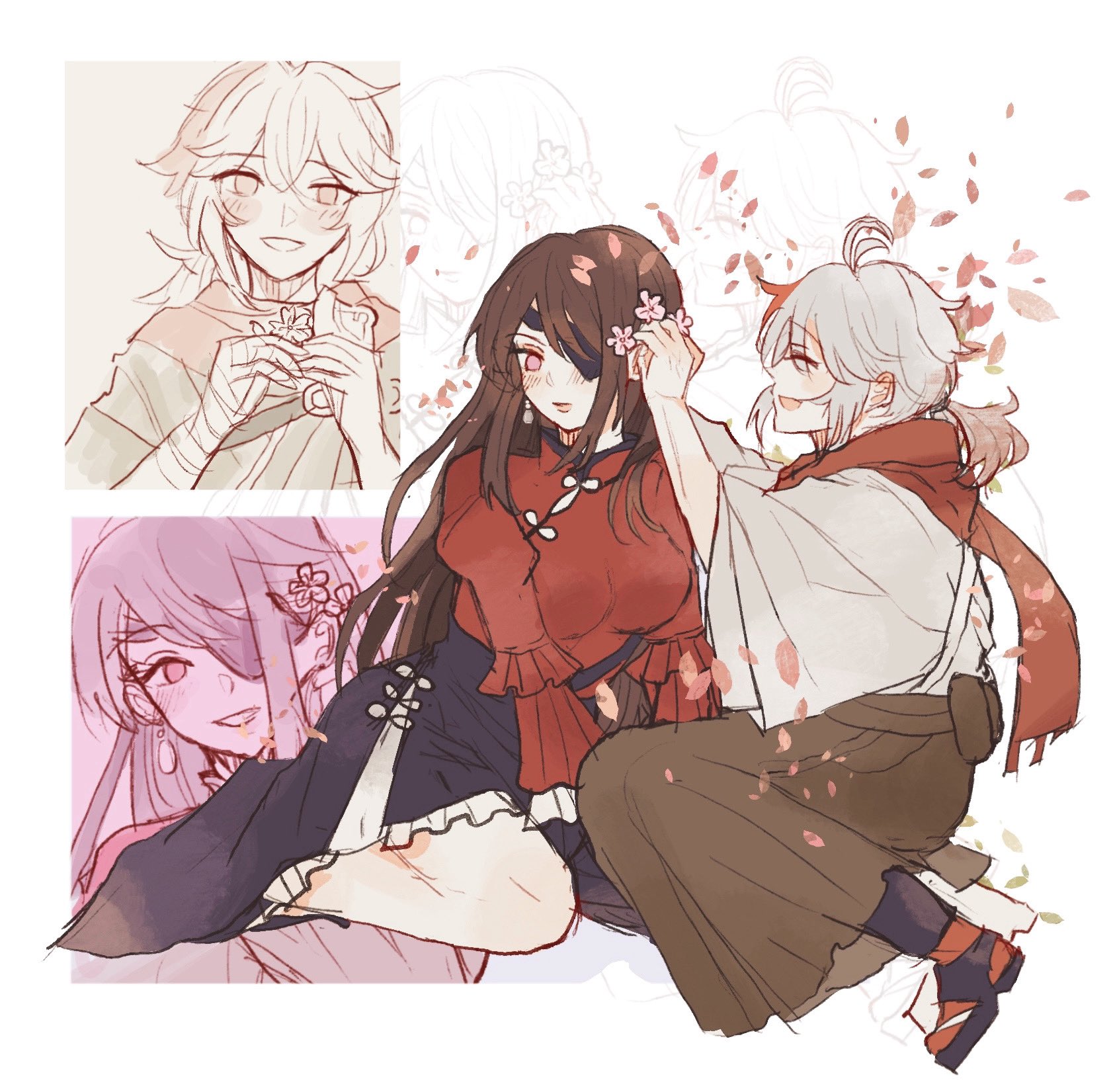 1boy 1girl ahoge alternate_costume beidou_(genshin_impact) black_skirt brown_hair chinese_clothes couple eyepatch flower full_body genshin_impact hair_between_eyes hair_flower hair_ornament hetero highres japanese_clothes kaedehara_kazuha kasep long_hair male_focus multicolored_hair red_eyes red_hair red_scarf red_shirt scarf shirt simple_background sitting skirt smile streaked_hair white_background white_hair