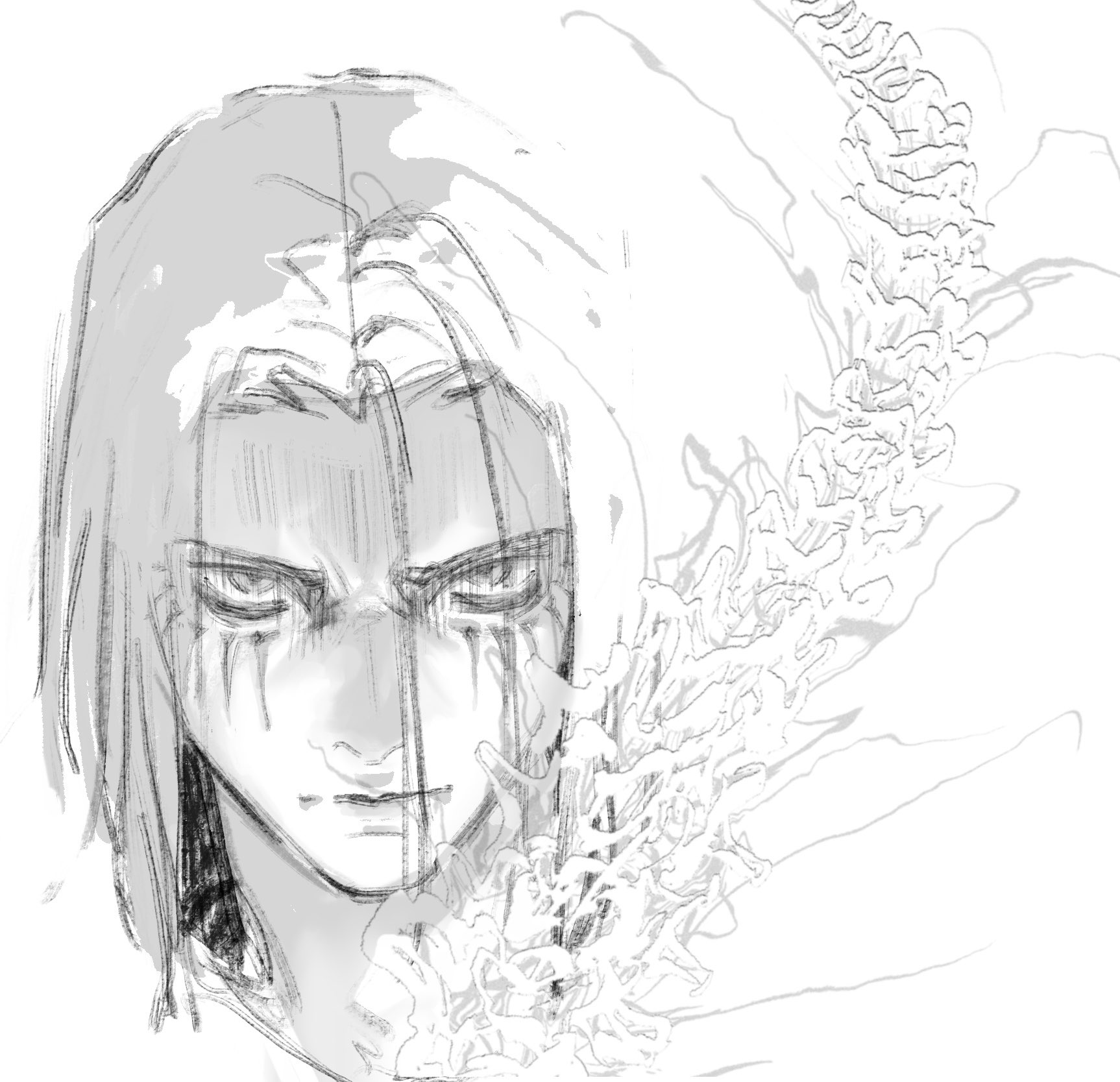 1boy angry closed_mouth eren_yeager facial_mark head_only highres long_hair looking_at_viewer male_focus n9c4z shingeki_no_kyojin simple_background sketch solo white_background