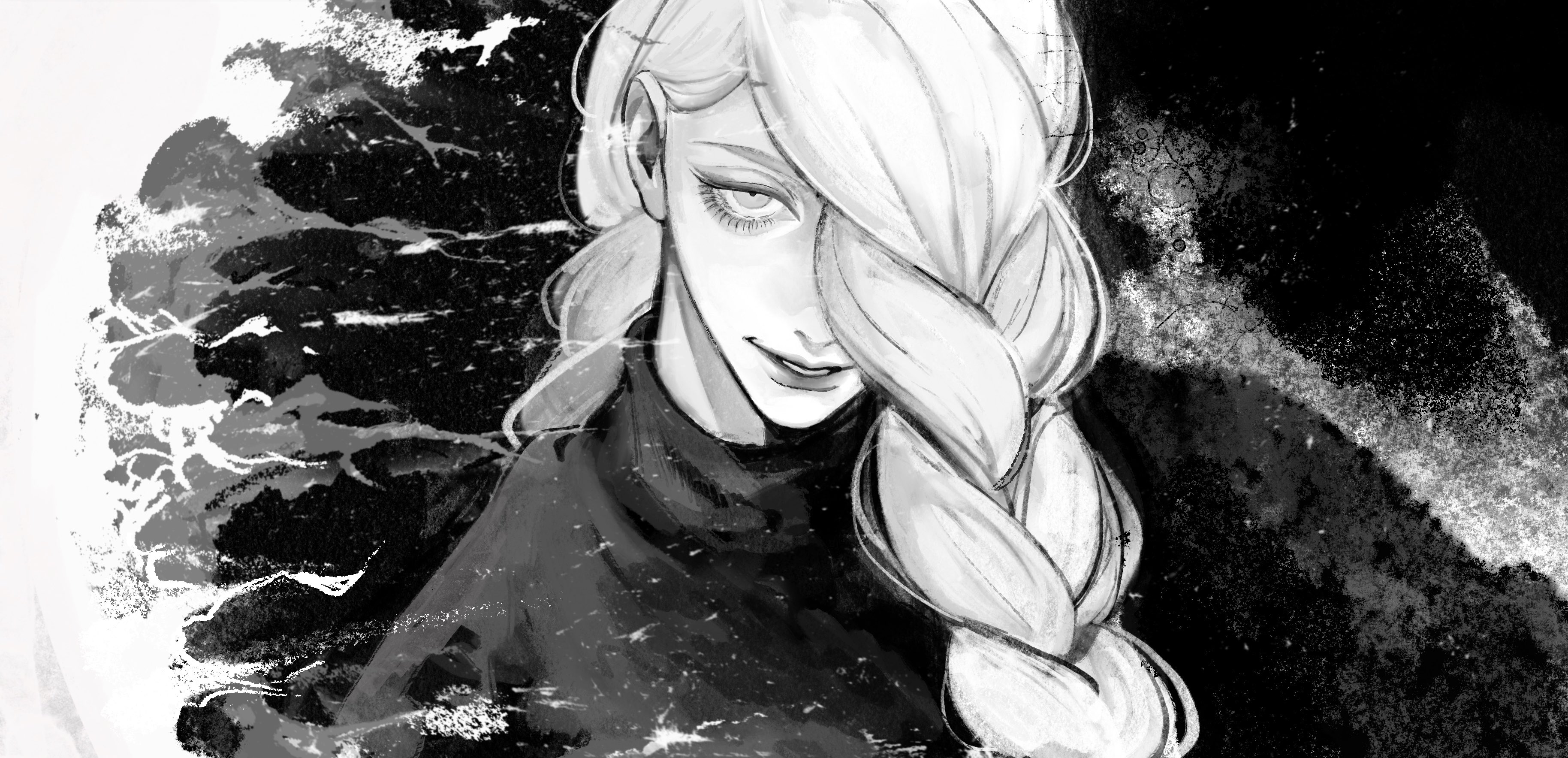 1girl absurdres black_dress braid braided_bangs braided_ponytail dress eyelashes grey_hair greyscale half-closed_eye highres jujutsu_kaisen light_smile long_hair looking_at_viewer mei_mei_(jujutsu_kaisen) monochrome monochrome_background n9c4z sketch solo very_long_hair