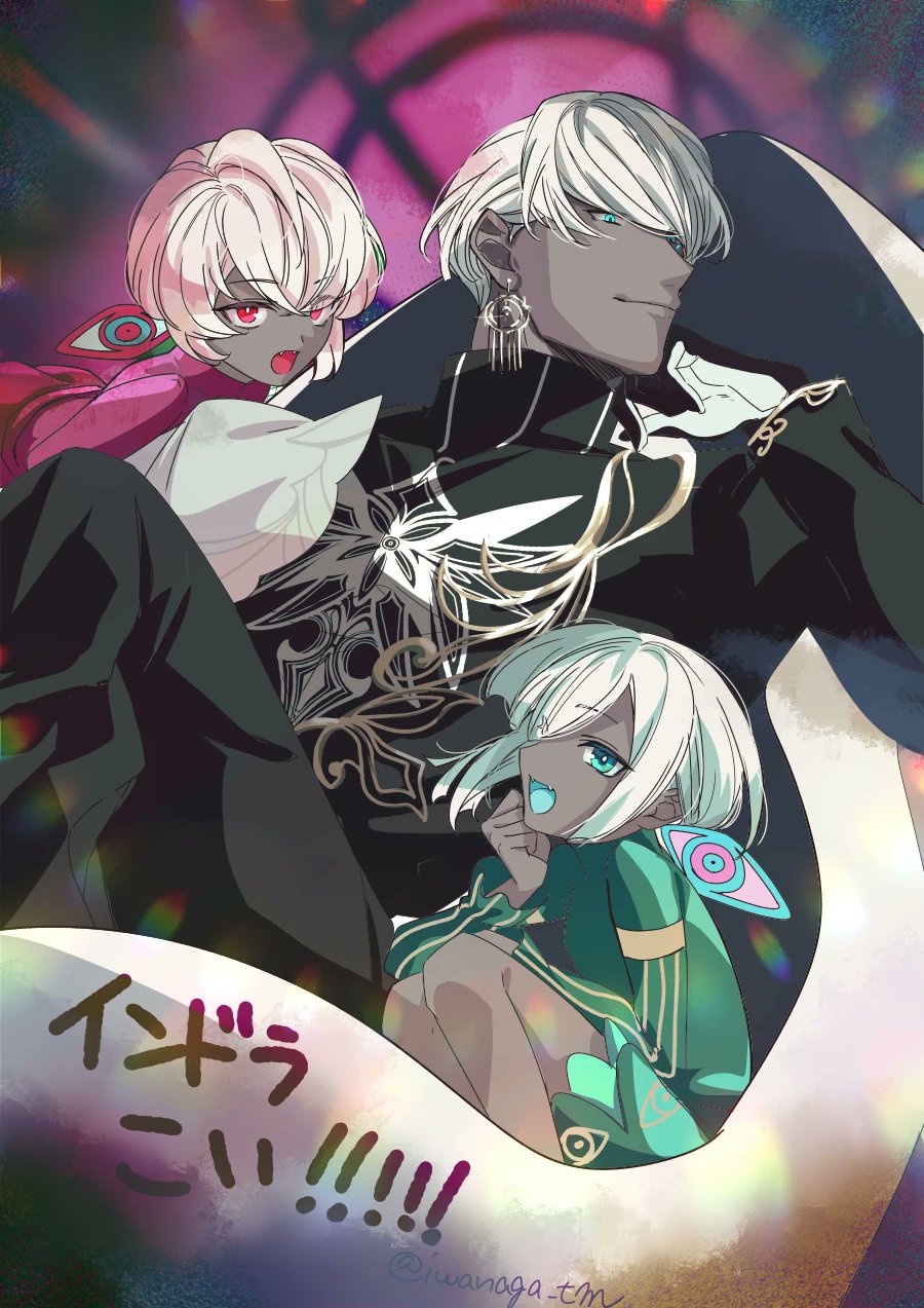 blue_eyes boy_vajra_(fate) colored_skin earrings fangs fate/grand_order fate_(series) girl_vajra_(fate) gloves green_eyes grey_skin highres indra_(fate) iwanaga_tm jewelry red_eyes sitting smile twitter_username two-tone_gloves white_hair