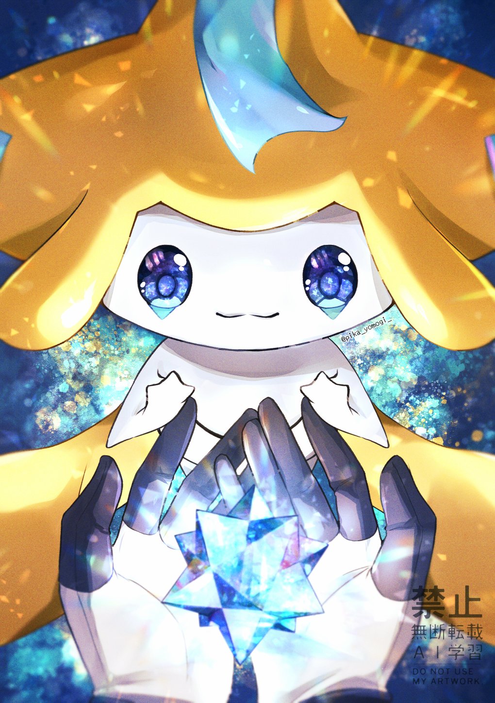 1girl animal_focus closed_mouth colored_skin floating gen_3_pokemon gloves highres holding jirachi legendary_pokemon looking_at_viewer may_(pokemon) mythical_pokemon night nintendo pokemon pokemon_(creature) pokemon_focus pokemon_ruby/sapphire/emerald star_(sky) star_(symbol) white_gloves white_skin yomogi_(black-elf)