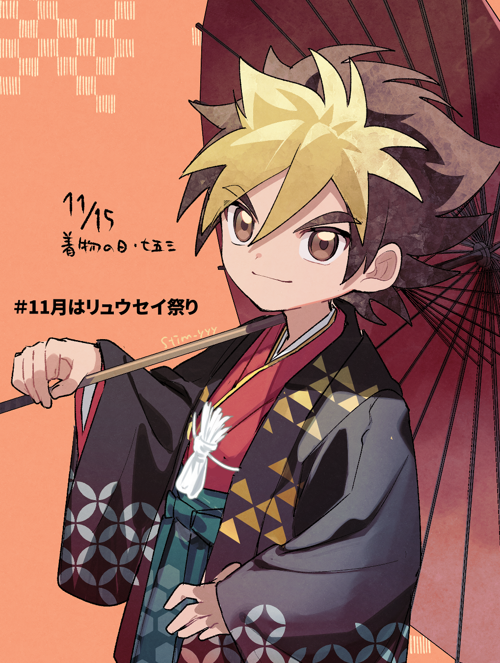 1boy amanogawa_ryuusei artist_name black_kimono blonde_hair brown_eyes brown_hair child closed_mouth commentary_request cowboy_shot dated green_hakama hair_between_eyes hakama hakama_skirt hand_on_own_hip highres holding holding_umbrella japanese_clothes jinzou_konchuu_kabutoborg_vxv kimono kuroda_(kuro_yyy) looking_at_viewer male_focus multicolored_hair oil-paper_umbrella open_clothes open_kimono shichi-go-san short_hair simple_background skirt smile solo translated two-tone_hair umbrella wide_sleeves