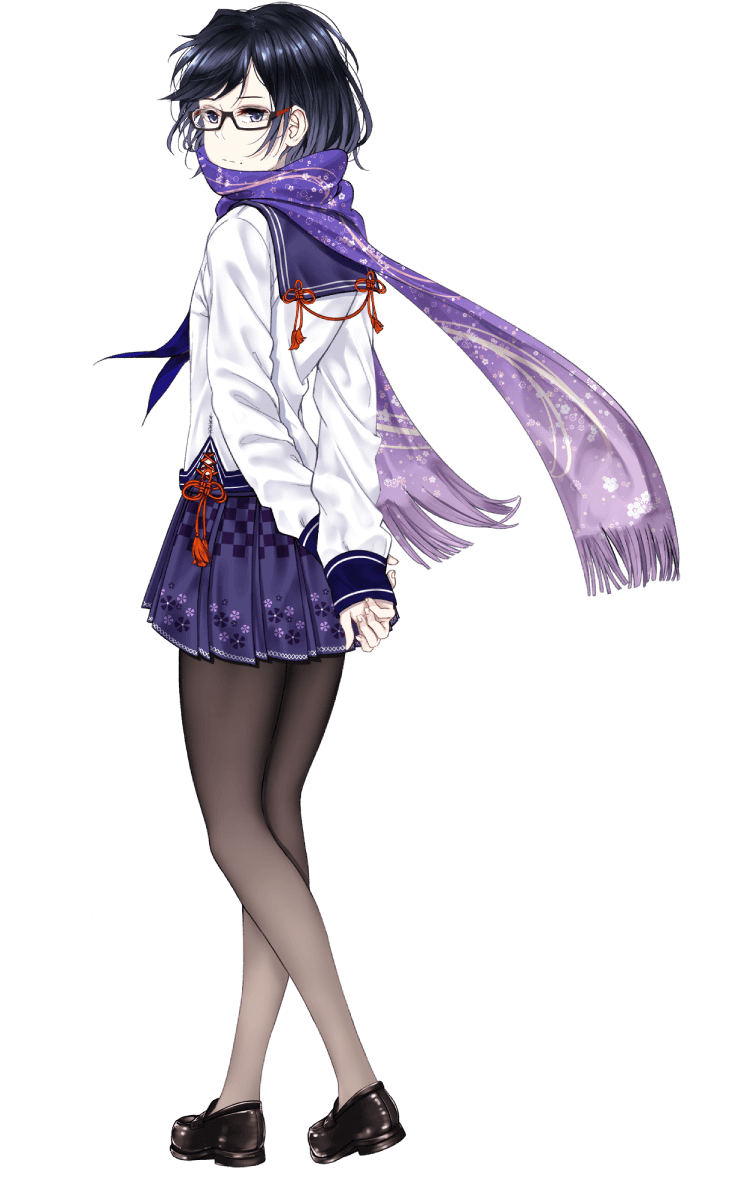 1girl black-framed_eyewear black_hair black_pantyhose black_shoes blue_sailor_collar floral_print floral_print_scarf floral_print_skirt full_body glasses highres long_sleeves looking_at_viewer official_art onsen_musume pantyhose pleated_skirt print_skirt purple_eyes purple_scarf purple_skirt sailor_collar saitou_(lynx-shrike) scarf shirt shoes simple_background skirt sleeves_past_wrists solo tassel toyako_nonno transparent_background white_shirt