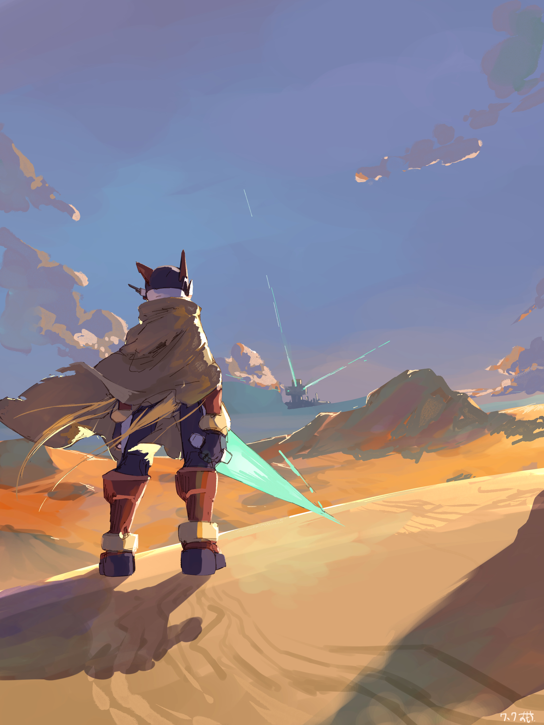 1boy brown_cloak cloak desert energy_sword from_behind full_body helmet highres holding holding_sword holding_weapon male_focus mega_man_(series) mega_man_zero_(series) omochi_(mochi_skymega) red_helmet solo standing sword weapon z_saber zero(z)_(mega_man) zero_(mega_man)