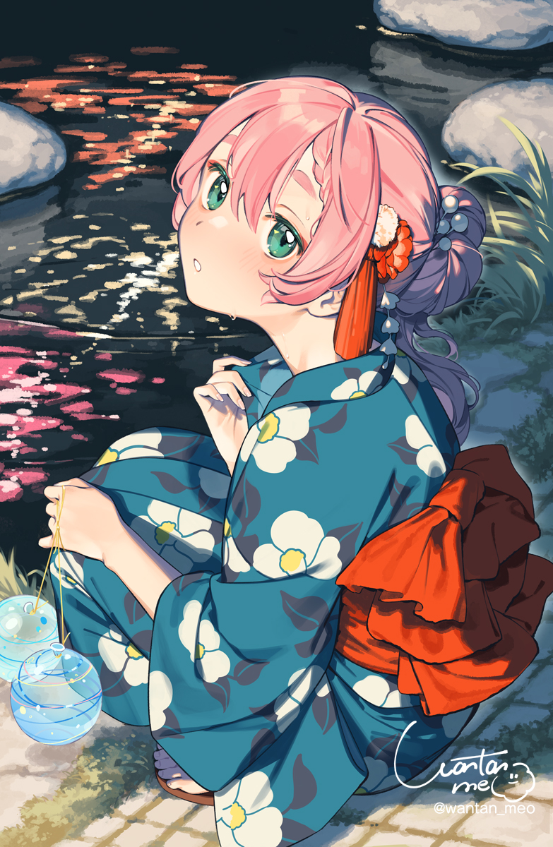 1girl blush commentary_request fireworks full_body green_eyes hair_bun hair_ornament highres japanese_clothes kanzashi kimono looking_at_viewer night original parted_lips pink_hair reflection reflective_liquid solo squatting summer sweat tanabata tassel thick_eyebrows wantan_meo water yukata