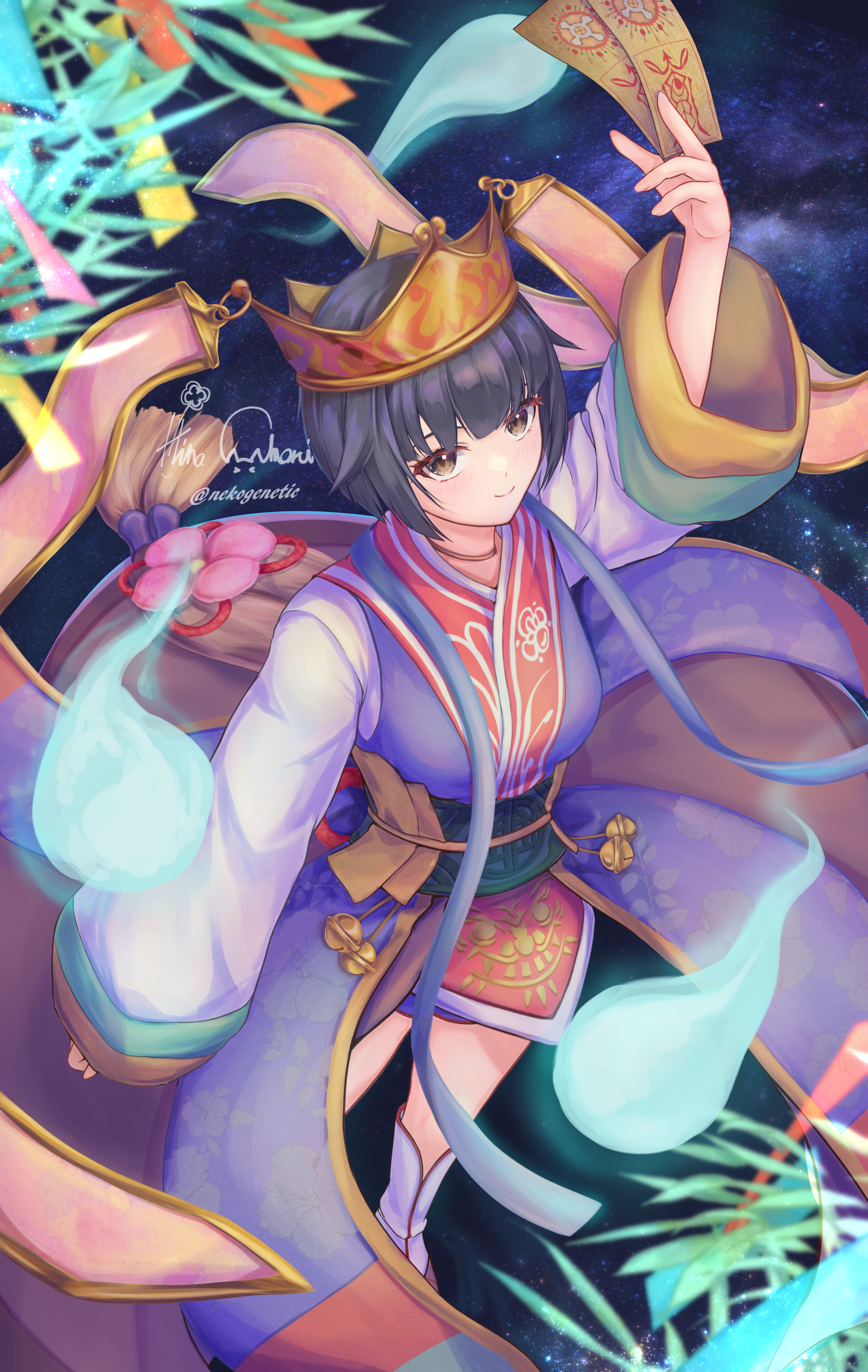 1girl absurdres black_hair brown_eyes brown_shoes closed_mouth coat commentary_request crown full_body ghost green_sash highres holding holding_ofuda long_sleeves looking_at_viewer nekogenetic night obi ofuda outdoors purple_coat ragnarok_online sash shirt shoes short_hair sky sleeveless sleeveless_coat smile socks solo soul_ascetic_(ragnarok_online) standing star_(sky) starry_sky tanabata white_shirt white_socks
