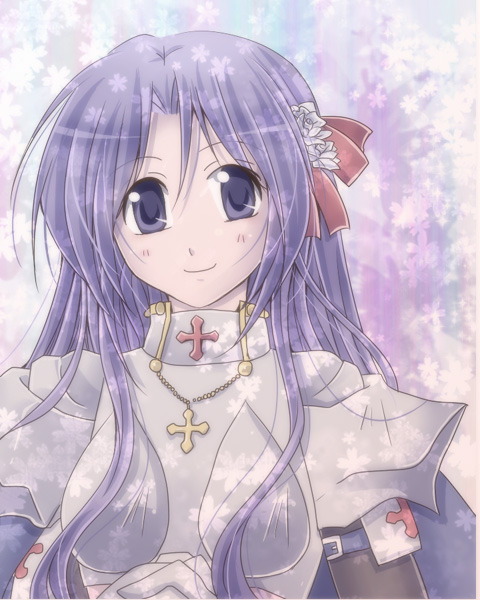 1girl armor blush boobplate bow breastplate closed_mouth commentary_request cross cross_necklace floral_background hair_bow jewelry long_hair looking_at_viewer necklace paladin_(ragnarok_online) pauldrons purple_background purple_eyes purple_hair ragnarok_online red_bow sharari shoulder_armor smile solo upper_body