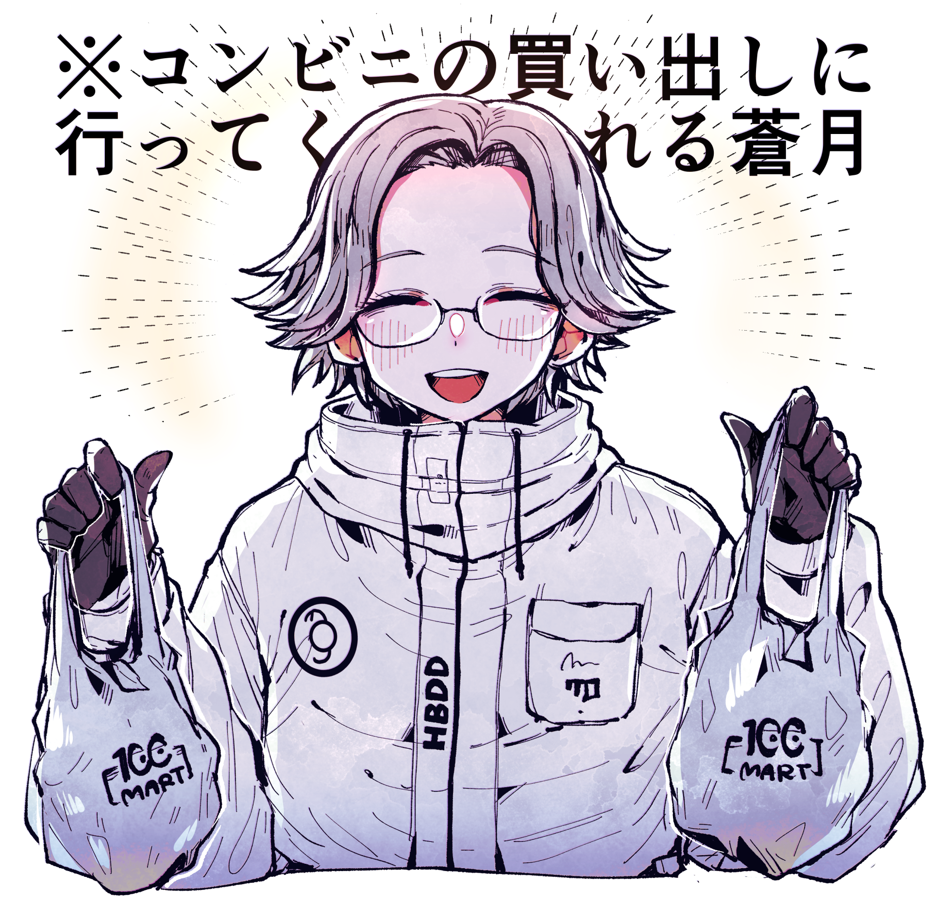 1boy :d ^_^ aotsuki_eito bag black_gloves breast_pocket closed_eyes cropped_torso facing_viewer glasses gloves grey_hair happy_aura highres holding holding_bag jacket light_blush maguro_no_yukke male_focus open_mouth pocket scene_reference shopping_bag short_hair simple_background smile solo teeth the_hundred_line_-last_defense_academy- upper_teeth_only white_background white_jacket