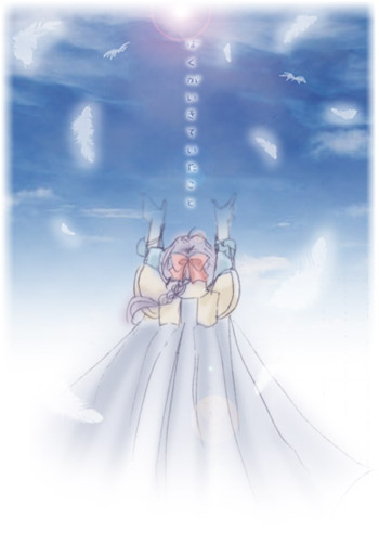 1girl 2000s_(style) arms_up blue_cape blue_sky bow braid braided_ponytail cape cloud commentary_request crusader_(ragnarok_online) dated_commentary feathers from_behind hair_bow lens_flare long_hair purple_hair ragnarok_online reaching red_bow sharari sky solo translation_request