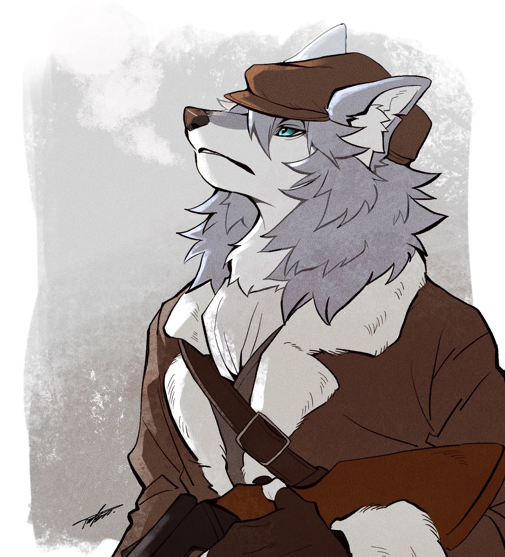 1boy animal_ears axontatsu brown_hat brown_jacket commentary fate/grand_order fate_(series) fur-trimmed_jacket fur_trim furry furry_male grey_fur grey_hair gun hat highres holding holding_gun holding_weapon jacket looking_up male_focus patxi_(fate) signature weapon wolf_boy wolf_ears