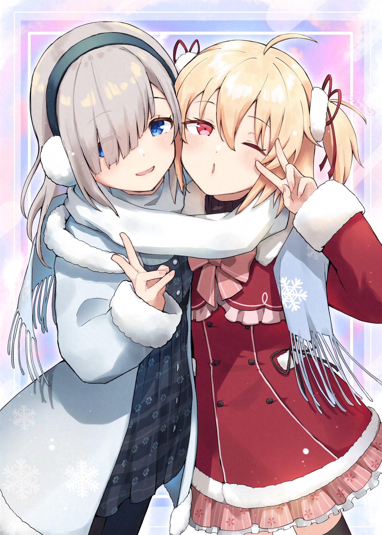 2girls ahoge asukaru_(magika_ru) ayano_rika blonde_hair blue_coat blue_eyes blush coat commentary cowboy_shot earmuffs fur-trimmed_coat fur-trimmed_sleeves fur_trim grey_hair hair_over_one_eye hair_ribbon hand_up highres isuzu_ren long_hair long_sleeves looking_at_viewer magia_record:_mahou_shoujo_madoka_magica_gaiden mahou_shoujo_madoka_magica multiple_girls one_eye_closed open_mouth red_coat red_eyes red_ribbon ribbon scarf shared_clothes shared_scarf short_hair short_twintails smile twintails v white_scarf