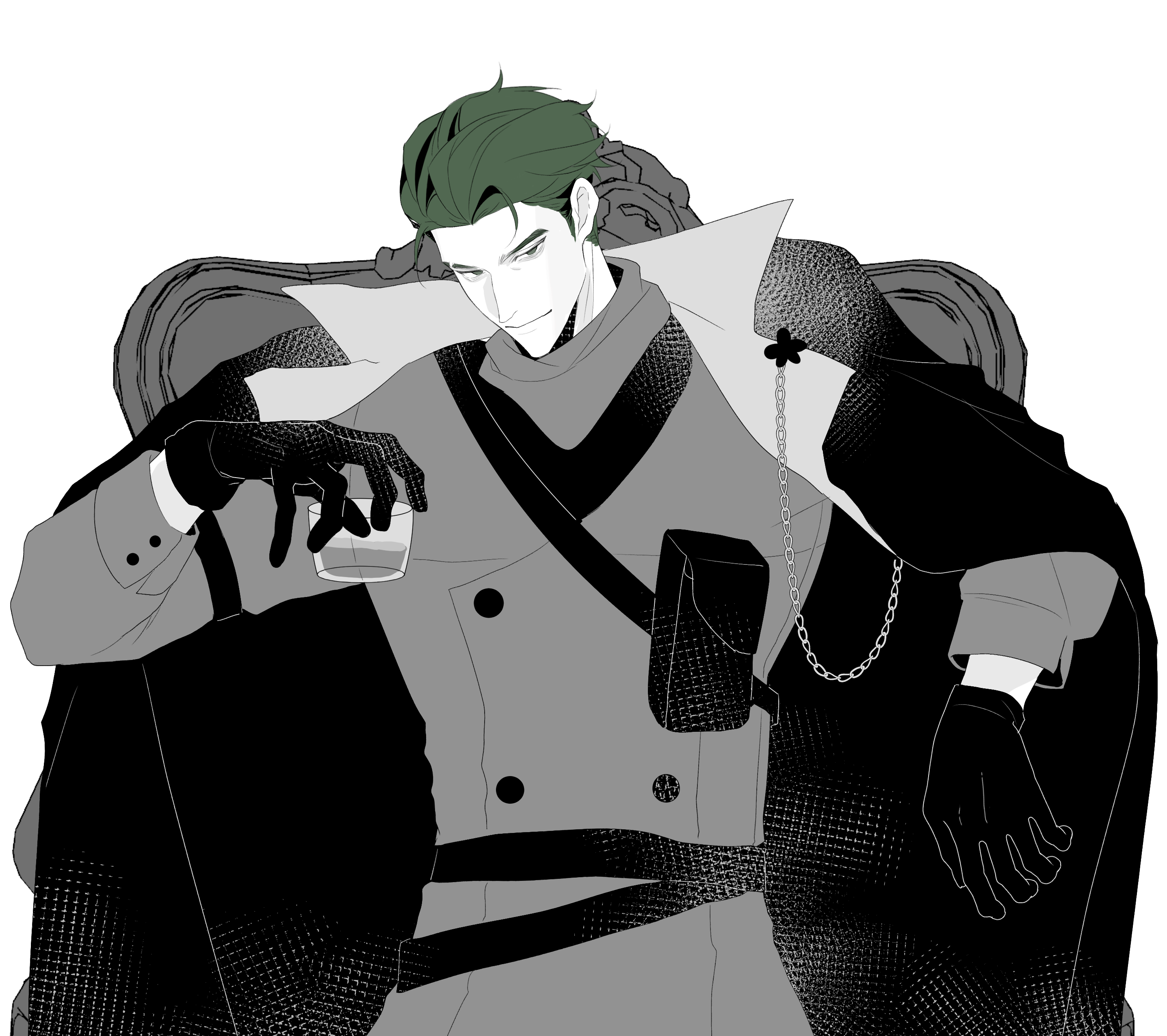 1boy absurdres bags_under_eyes buttons chain chair character_name closed_mouth coat coat_on_shoulders commentary_request cup double-breasted gloves green_eyes green_hair greyscale hair_behind_ear hair_slicked_back high_contrast highres holding holding_cup jacket long_sleeves looking_at_viewer male_focus monochrome on_chair peashooter_(plants_vs._zombies) personification plants_vs._zombies puffy_long_sleeves puffy_sleeves rrtion short_hair simile simple_background solo spot_color turtleneck turtleneck_jacket upper_body very_short_hair white_background