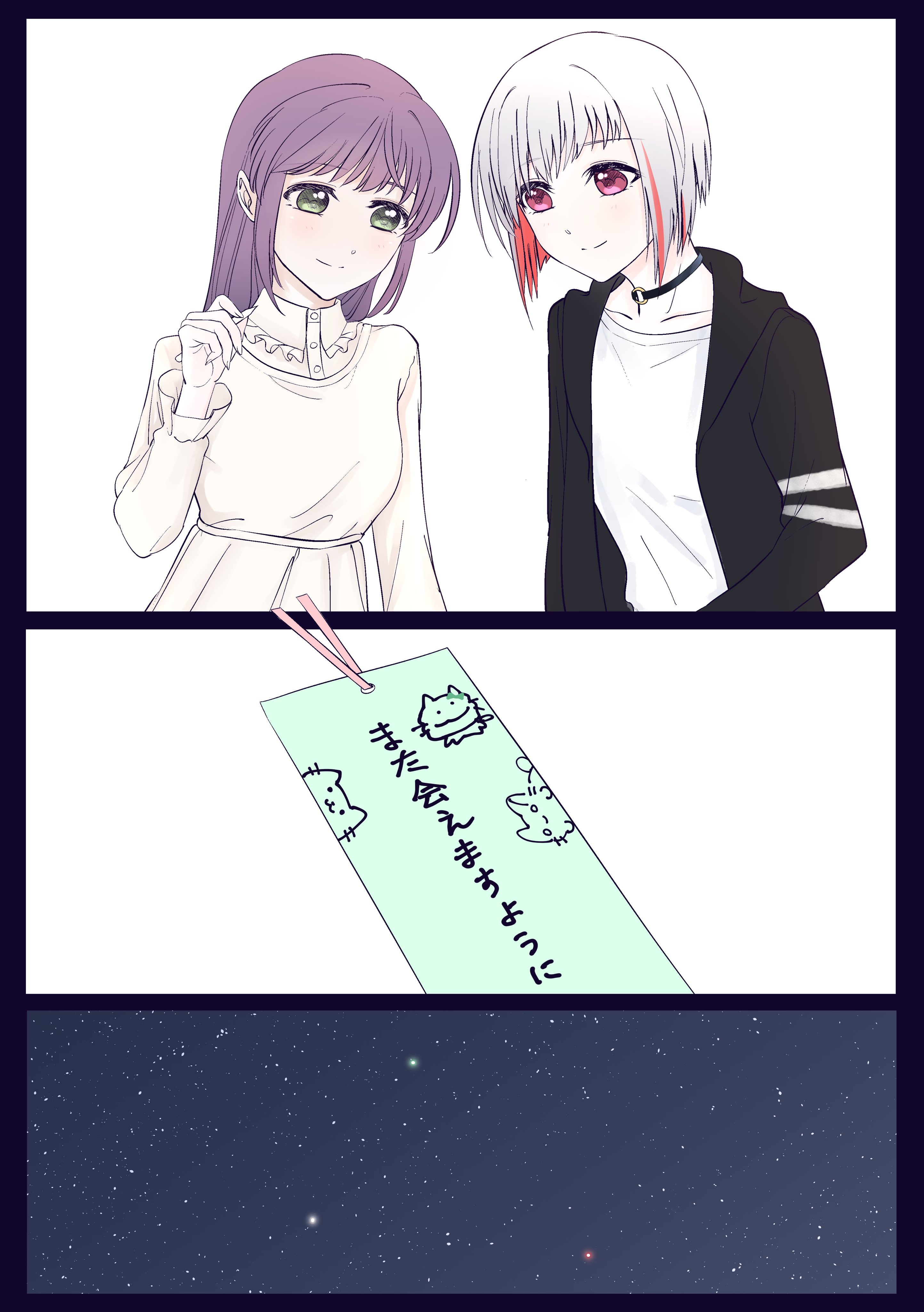 2girls absurdres aegis_zan black_choker black_jacket bob_cut breasts choker closed_mouth collarbone collared_dress colored_inner_hair commentary dress frilled_shirt_collar frills green_eyes hair_down hanamiya_nina_(style) highres inverted_bob jacket link!_like!_love_live! long_sleeves love_live! medium_breasts multicolored_hair multiple_girls o-ring o-ring_choker official_alternate_costume official_alternate_hairstyle open_clothes open_jacket otomune_kozue otomune_kozue_(summer_loungewear) pink_eyes purple_hair red_hair shirt short_hair sidelocks smile streaked_hair tanabata tanzaku translation_request virtual_youtuber white_dress white_hair white_shirt yugiri_tsuzuri yugiri_tsuzuri_(summer_loungewear)