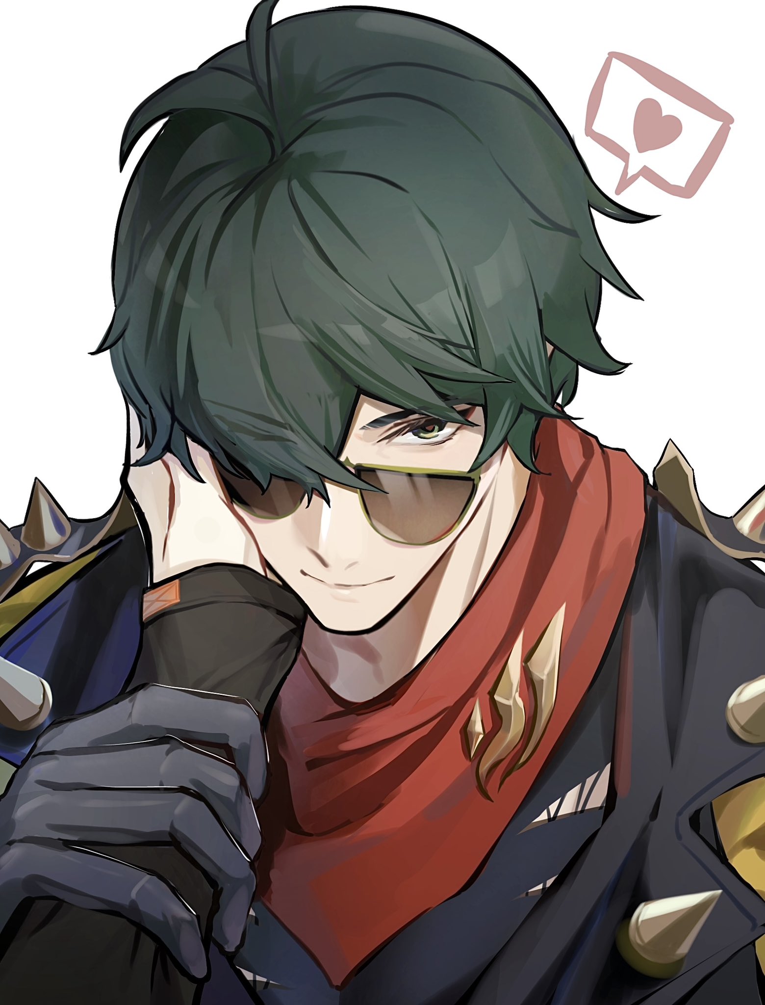 2boys bandana bandana_around_neck black_gloves black_jacket black_shirt closed_mouth commentary_request gloves green_eyes green_hair hair_between_eyes hand_on_another's_arm hand_on_another's_face heart highres jacket lighter_(zenless_zone_zero) long_sleeves male_focus multiple_boys nmmm_mm out_of_frame outstretched_arm parted_bangs red_bandana shirt simple_background smile solo_focus speech_bubble spiked_jacket spikes spoken_heart sunglasses upper_body white_background wise_(zenless_zone_zero) yaoi zenless_zone_zero