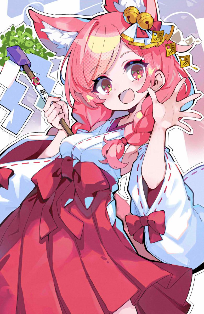 1girl animal_ear_fluff animal_ears armpits astral_party bell braid breasts detached_sleeves gohei hair_bell hair_ornament hands_up highres holding holding_gohei looking_at_viewer medium_breasts nontraditional_miko omochishiki open_mouth outline pink_eyes pink_hair pleated_skirt red_skirt shirt sidelocks simple_background skirt smile solo teru_(astral_party) torii twin_braids white_background white_shirt