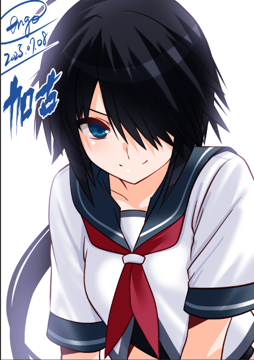 1girl artist_name black_hair black_sailor_collar blue_eyes character_name commentary_request dated engo_(aquawatery) hair_over_one_eye kako_(kancolle) kako_kai_ni_(kancolle) kantai_collection long_hair low_ponytail messy_hair neckerchief one-hour_drawing_challenge ponytail red_neckerchief sailor_collar sailor_shirt school_uniform serafuku shirt short_sleeves signature simple_background solo white_background
