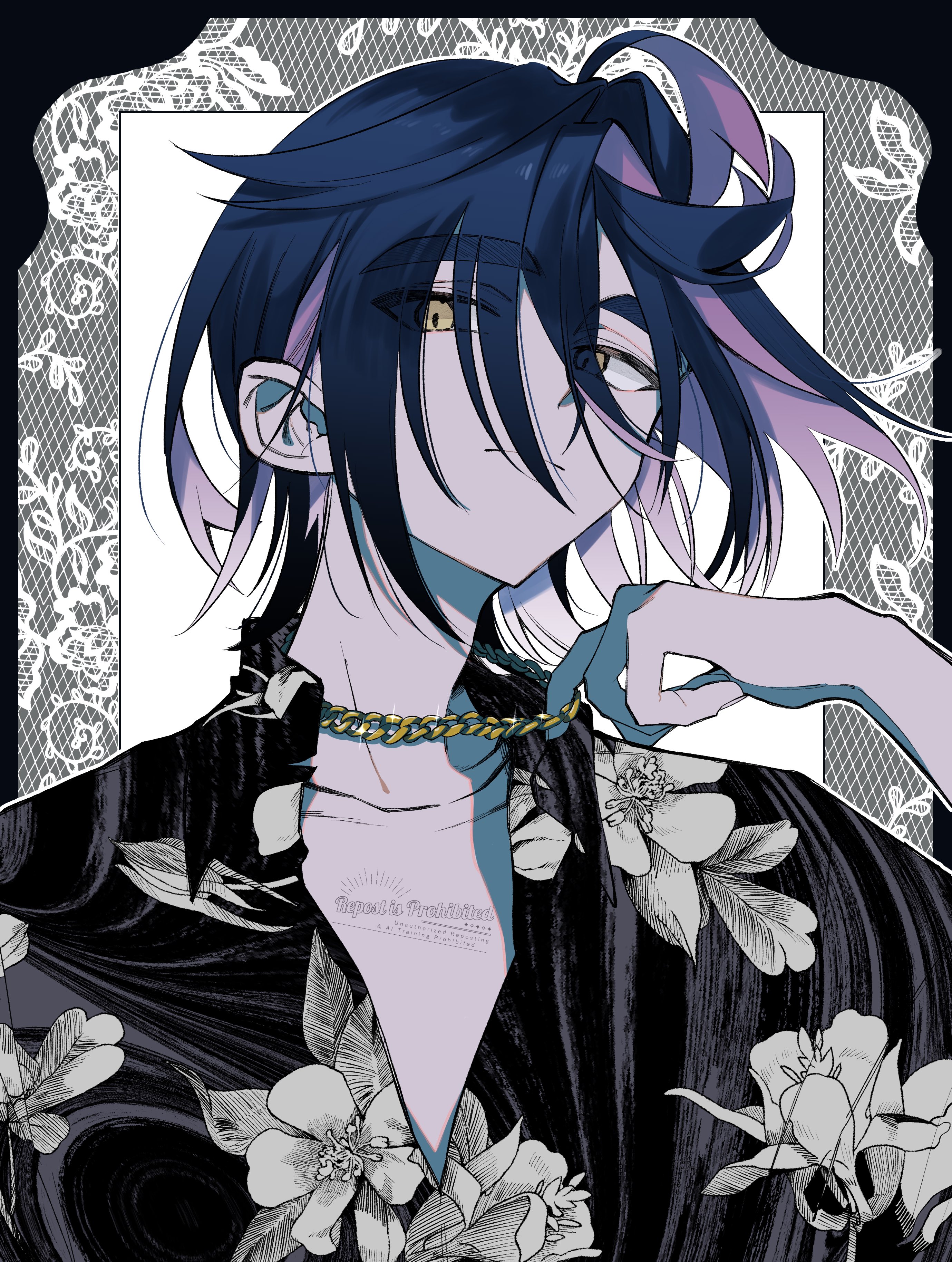 1boy absurdres aged_up ahoge black_hair black_shirt chain chain_necklace closed_mouth collared_shirt commentary_request floral_print hand_up hei_tai_(kyaputen1) highres jewelry kieran_(pokemon) long_bangs male_focus multicolored_hair necklace nintendo pokemon pokemon_scarlet_and_violet shirt solo two-tone_hair undershirt upper_body yellow_eyes