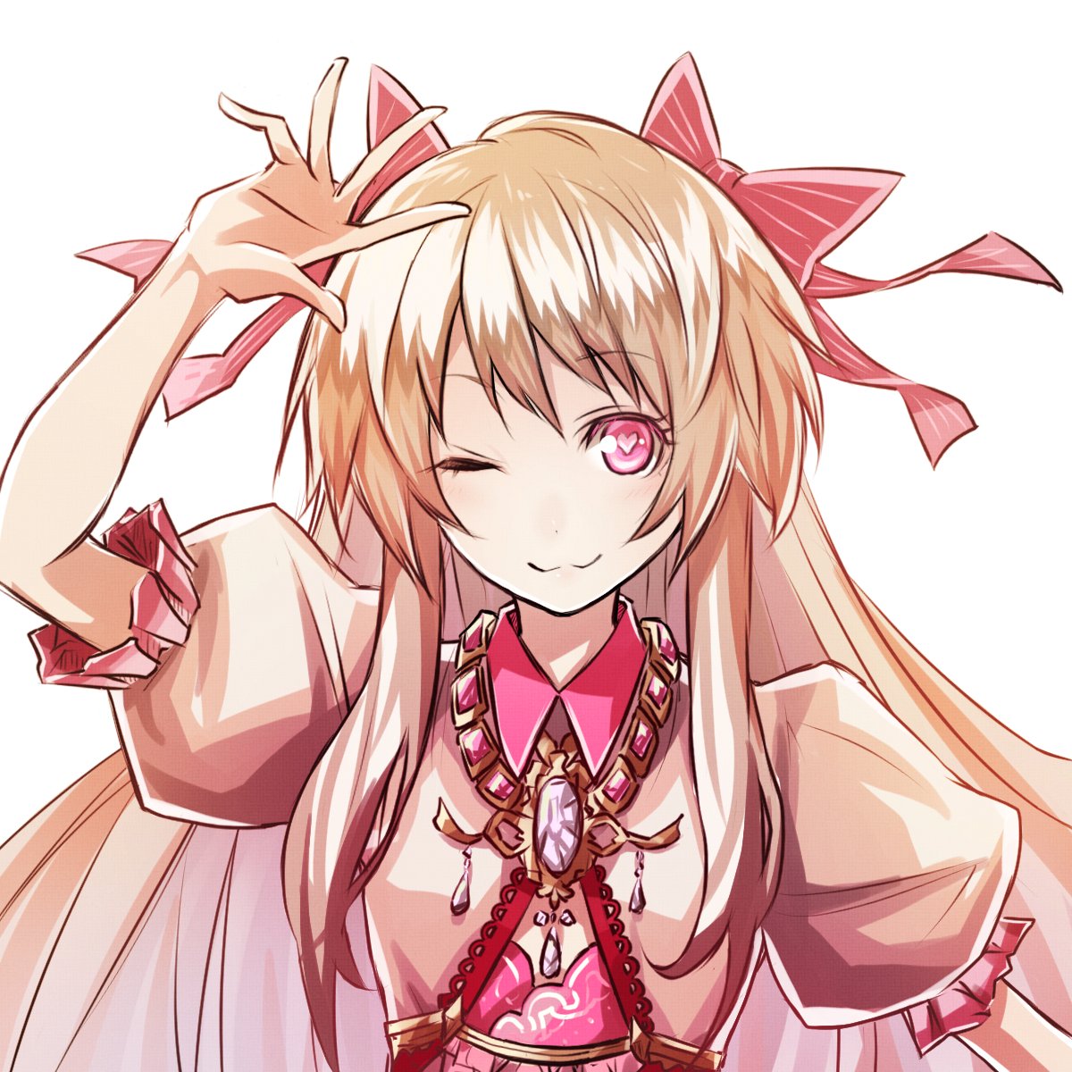 1girl ;3 blonde_hair breasts chaos_marie_(grimms_notes) cleavage cleavage_cutout closed_mouth clothing_cutout collar corset diamond_necklace frilled_corset frills grimms_notes hair_ribbon hana_grimms hand_up heart heart-shaped_pupils highres jewelry long_hair necklace one_eye_closed pink_collar pink_corset pink_ribbon puffy_short_sleeves puffy_sleeves ribbon shirt short_sleeves sidelocks simple_background solo symbol-shaped_pupils white_background white_shirt