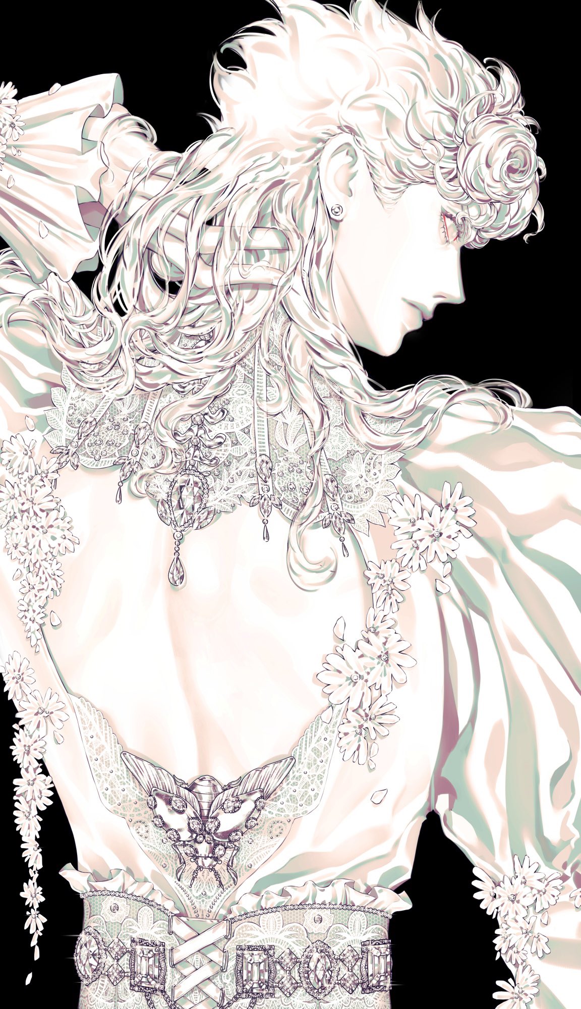 1boy back back_cutout backless_outfit black_background bug clothing_cutout commentary cross-laced_clothes earrings flower frilled_sleeves frills from_behind giorno_giovanna hand_in_own_hair hand_on_own_neck hashtag-only_commentary highres jewelry jojo_no_kimyou_na_bouken ladybug_ornament long_hair long_sleeves looking_at_viewer looking_back male_focus monochrome profile puffy_sleeves solo stud_earrings upper_body vento_aureo zhhy3324