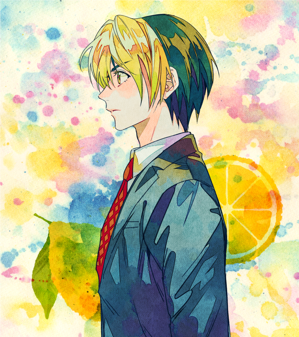 1boy blazer blonde_hair blue_jacket brown_eyes food fruit green_hair hikaru_no_go hun_(endlesslovehikaru) jacket lemon lemon_slice long_sleeves male_focus multicolored_hair necktie profile red_necktie school_uniform shindou_hikaru short_hair solo two-tone_hair upper_body
