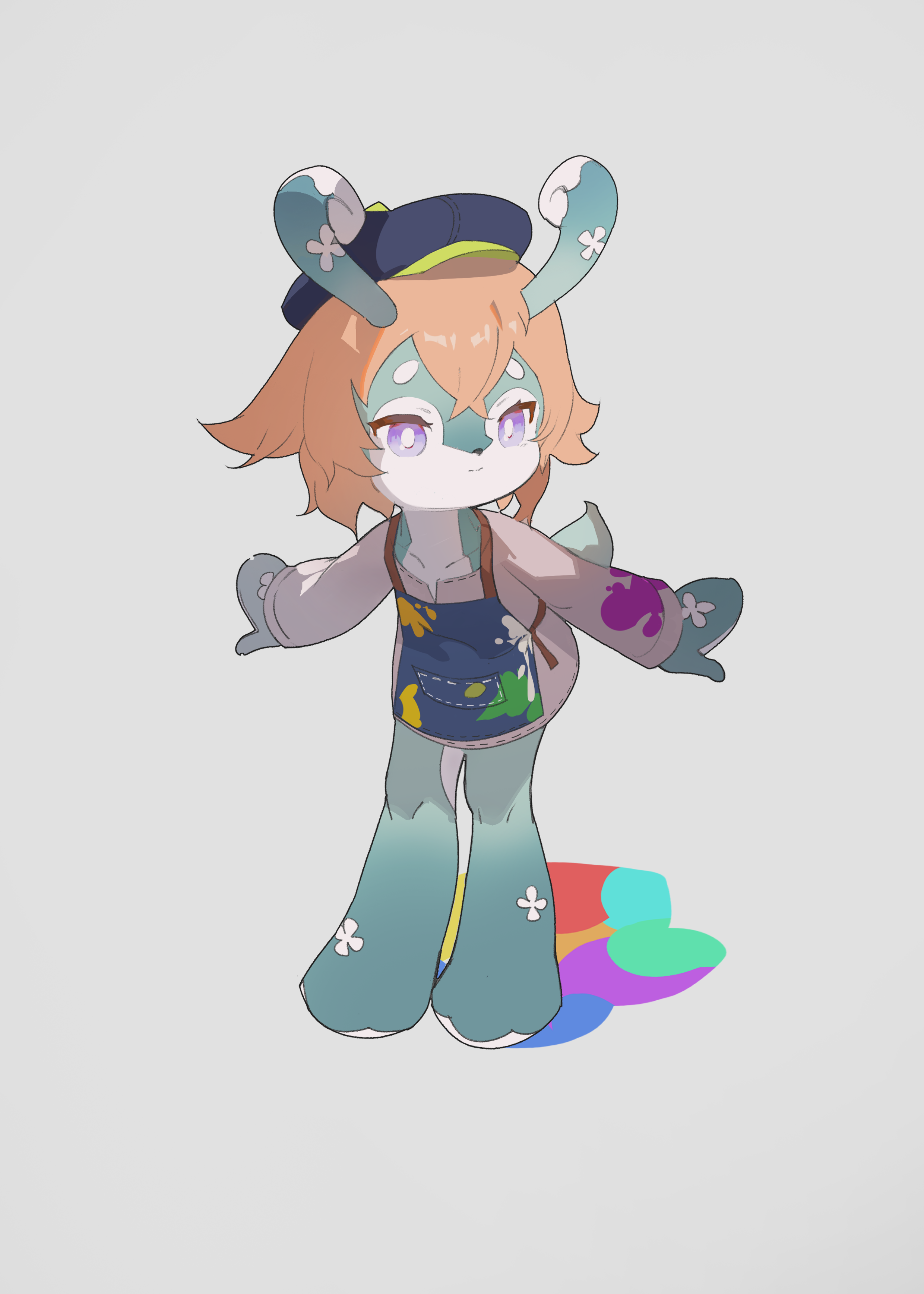 1girl absurdres apron blue_apron blue_hat brown_dress child closed_mouth collarbone dress expressionless full_body furry furry_female genshin_impact grey_background hair_between_eyes hat highres mamere_(genshin_impact) melusine_(genshin_impact) nutchair orange_hair paint_splatter short_dress short_hair simple_background solo