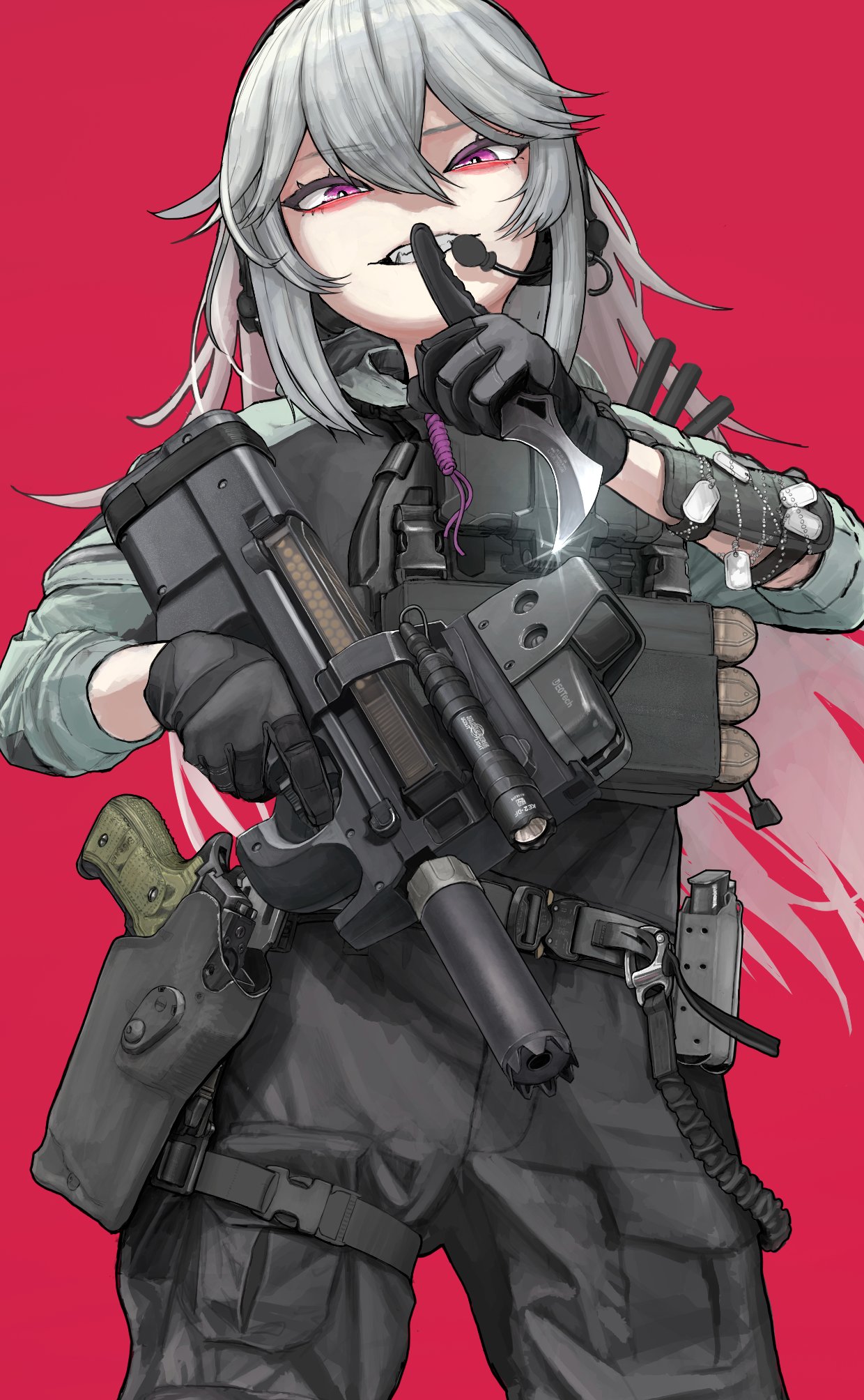 1girl ammunition_pouch black_gloves black_pants bulletproof_vest clenched_teeth commentary_request commission dog_tags ear_protection finger_to_mouth flashlight gloves green_jacket grey_hair gun hair_between_eyes handgun highres holding holding_gun holding_knife holding_weapon jacket knife long_hair looking_at_viewer magazine_(weapon) nyo551 original pants pouch purple_eyes red_background shushing sig_p220/p226 sig_sauer simple_background skeb_commission solo suppressor tactical_clothes teeth weapon