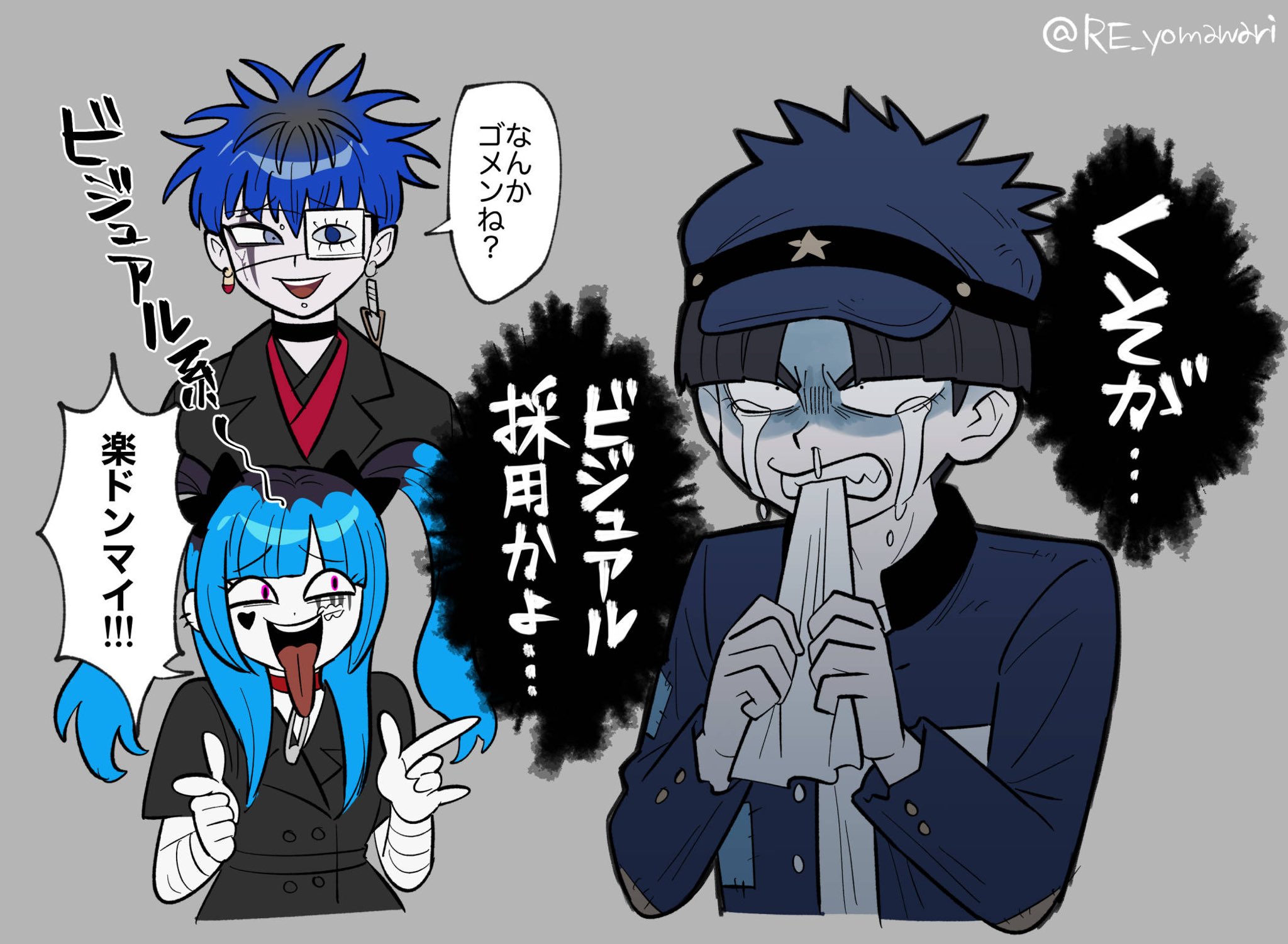 1girl 2boys alternate_costume amemiya_darumi angry bandaged_wrist bandages biting black_collar black_hair black_jacket blue_eyes blue_hair blue_jacket collar earrings eyepatch furukawa_(yomawari) grey_background heart highres jacket jewelry maruko_gaku multiple_boys omokage_yugamu pink_eyes red_collar safety_pin short_hair speech_bubble tears teeth the_hundred_line_-last_defense_academy- tongue tongue_out twintails upper_body