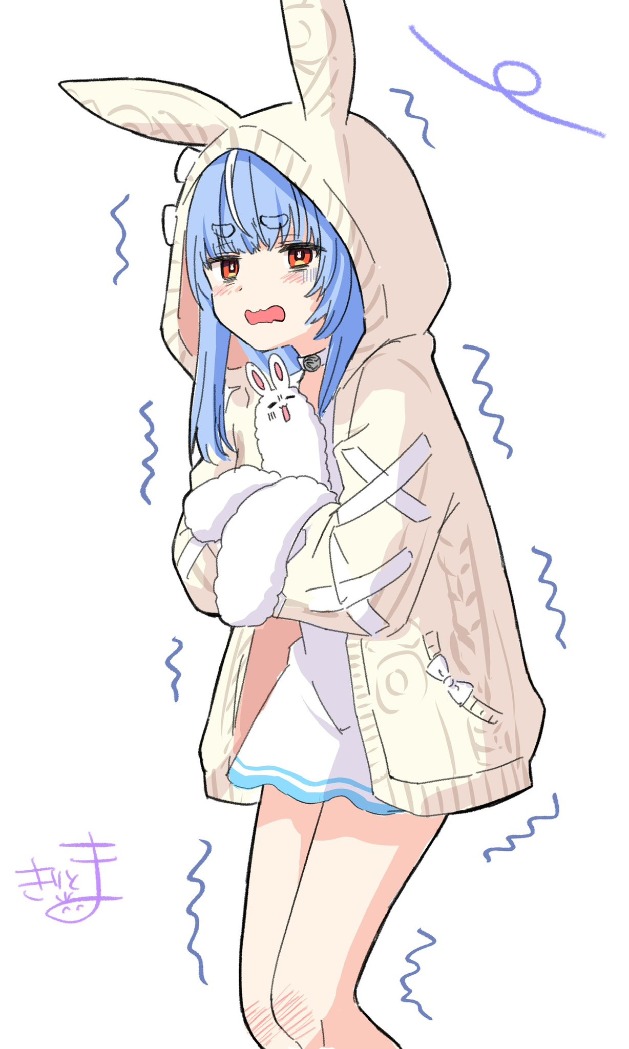1girl animal_ears animal_hood blue_hair blush brown_jacket commentary_request don-chan_(usada_pekora) dress fake_animal_ears feet_out_of_frame highres hololive hood hood_up hooded_jacket jacket kiritoma long_hair rabbit-shaped_pupils rabbit_ears rabbit_hood red_eyes short_eyebrows signature simple_background solo symbol-shaped_pupils thick_eyebrows trembling usada_pekora usada_pekora_(casual) virtual_youtuber white_background white_dress wind