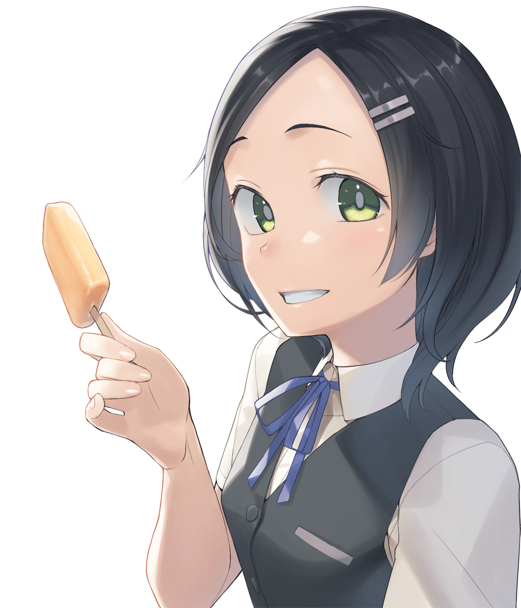 1girl black_hair black_vest blue_ribbon collared_shirt commentary_request food green_eyes hair_ornament hairclip heibonkaeru highres holding holding_food holding_popsicle kantai_collection kuroshio_(kancolle) looking_at_viewer neck_ribbon popsicle ribbon school_uniform shirt short_hair short_sleeves simple_background solo upper_body vest white_background white_shirt