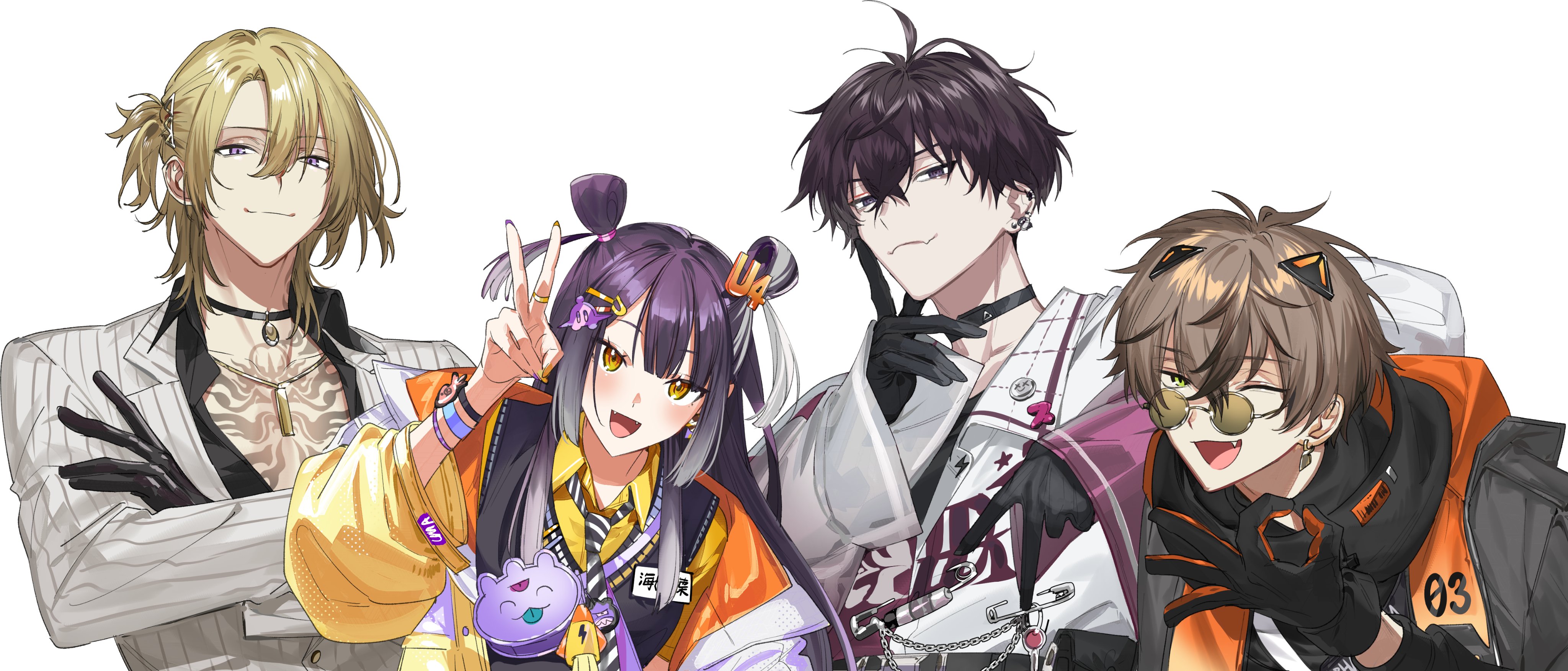 1girl 3boys ;d absurdres alban_knox alban_knox_(1st_costume) arm_on_another's_shoulder black_choker black_gloves black_hair black_hoodie black_necktie black_shirt black_sweater_vest blonde_hair blush bracelet brown-tinted_eyewear brown_hair chain chest_tattoo choker closed_mouth coat collared_shirt commentary crossed_arms crossed_bangs diagonal-striped_clothes diagonal-striped_necktie double-parted_bangs double_bun ear_piercing earrings fang fang_out glasses gloves green_eyes hair_between_eyes hair_bun hair_ornament hairclip hand_up highres hood hood_down hoodie jacket jewelry kaohom503 lapels long_hair long_sleeves looking_at_viewer luca_kaneshiro luca_kaneshiro_(1st_costume) multicolored_hair multicolored_jacket multiple_boys name_tag neck_tattoo necklace necktie nijisanji nijisanji_en off_shoulder ok_sign one_eye_closed one_side_up open_clothes open_coat open_collar open_jacket open_mouth orange_eyes orange_gloves orange_jacket parted_bangs piercing pinstripe_jacket pinstripe_pattern puffy_long_sleeves puffy_sleeves purple_eyes purple_shirt ring round_eyewear safety_pin saiki_ittetsu saiki_ittetsu_(1st_costume) school_uniform shirt short_hair short_side_ponytail side_ponytail simple_background single_earring skin_fang smile striped_clothes striped_necktie sweater_vest tattoo tinted_eyewear two-sided_fabric two-sided_jacket two-tone_gloves two-tone_shirt two_side_up umise_yotsuha umise_yotsuha_(1st_costume) untranslatable_commentary upper_body v virtual_youtuber white_background white_jacket white_necktie white_shirt wide_sleeves wing_collar yellow_jacket yellow_shirt