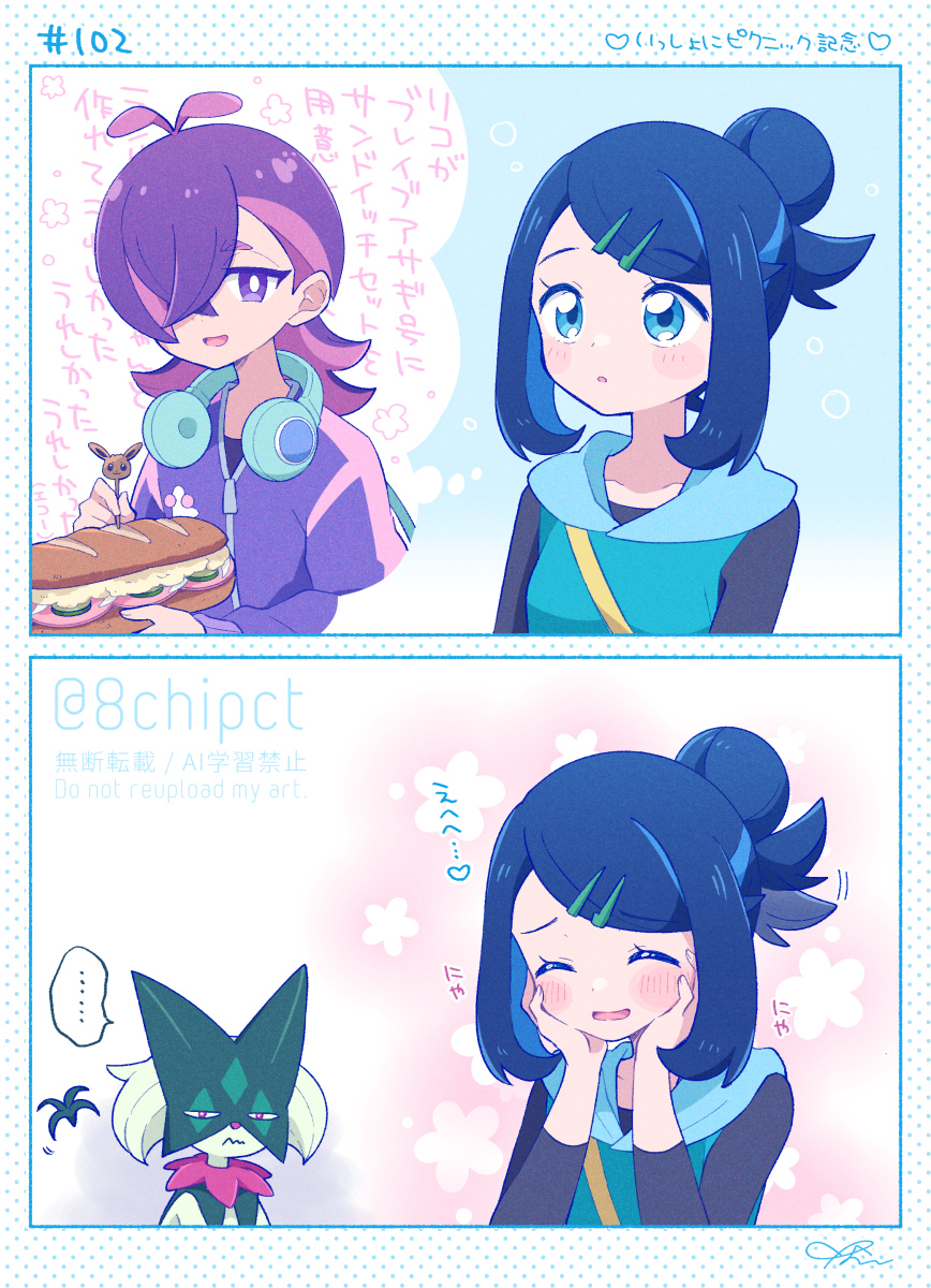 ... 0zr8hc 2girls antenna_hair black_hair black_shirt blush closed_eyes commentary_request dot_(pokemon) food hair_bun hair_ornament hairclip hands_up headphones heart highres holding holding_food jacket liko_(pokemon) long_hair meowscarada multiple_girls nintendo open_mouth pokemon pokemon_(anime) pokemon_(creature) pokemon_horizons purple_hair purple_jacket sandwich shirt sidelocks skewer spoken_ellipsis swept_bangs translation_request twitter_username vest zipper_pull_tab