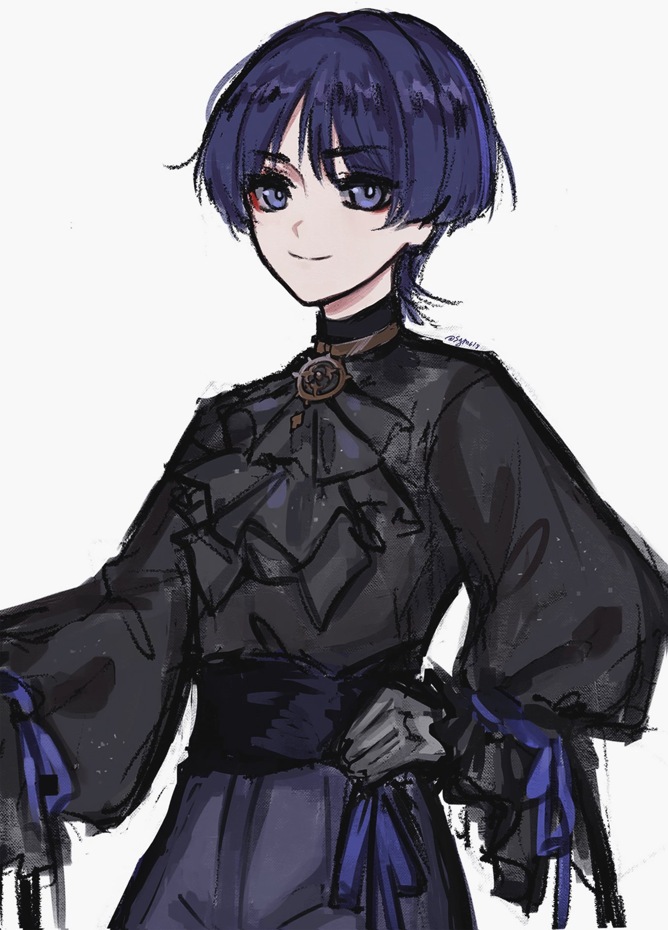 1boy alternate_costume ascot black_ascot black_corset black_shirt black_sleeves blunt_ends choppy_bangs closed_mouth corset eyeliner eyeshadow genshin_impact gold grey_pupils hand_on_own_hip highres jewelry long_sleeves looking_at_viewer makeup male_focus mitsudomoe_(shape) multicolored_hair neck_ring pants puffy_sleeves purple_eyes purple_hair purple_pants purple_ribbon red_eyeliner red_eyeshadow ribbon scaramouche_(genshin_impact) sgm618 shirt sketch sleeve_ribbon smile solo streaked_hair tomoe_(symbol) upper_body white_background