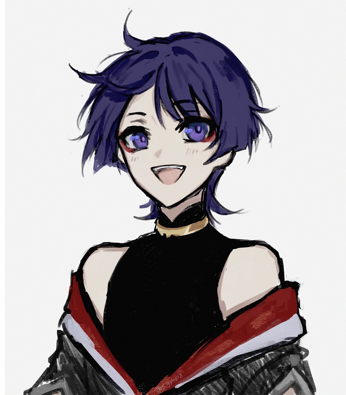 1boy asymmetrical_bangs black_bodysuit blunt_ends bodysuit cowlick eyeliner eyeshadow genshin_impact gold grey_kimono grey_sleeves happy highres japanese_clothes jewelry juban kimono looking_at_viewer makeup male_focus mandarin_collar messy_hair neck_ring off_shoulder open_mouth purple_eyes purple_hair red_eyeliner red_eyeshadow red_kimono scaramouche_(genshin_impact) sgm618 short_sleeves sketch solo teeth tongue twitter_username upper_body upper_teeth_only white_background white_kimono
