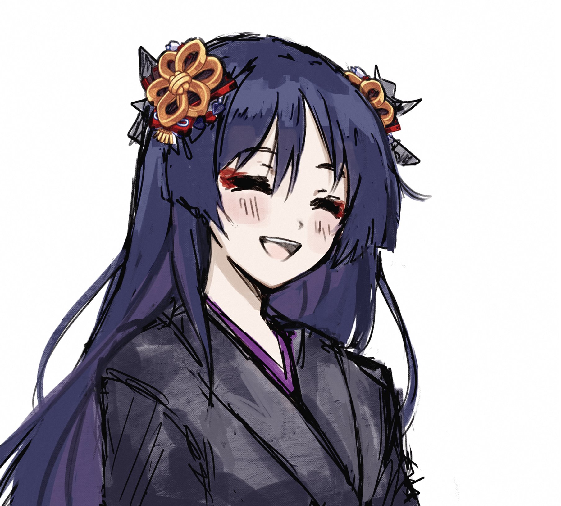 1boy alternate_costume alternate_hair_length alternate_hairstyle androgynous black_hair black_kimono blunt_ends blush choppy_bangs closed_eyes eyeliner eyeshadow facing_viewer genshin_impact hair_ornament highres japanese_clothes juban kimono long_hair makeup male_focus open_mouth portrait purple_hair purple_kimono red_eyeliner red_eyeshadow scaramouche_(genshin_impact) scaramouche_(kabukimono)_(genshin_impact) sgm618 sketch solo teeth upper_teeth_only white_background