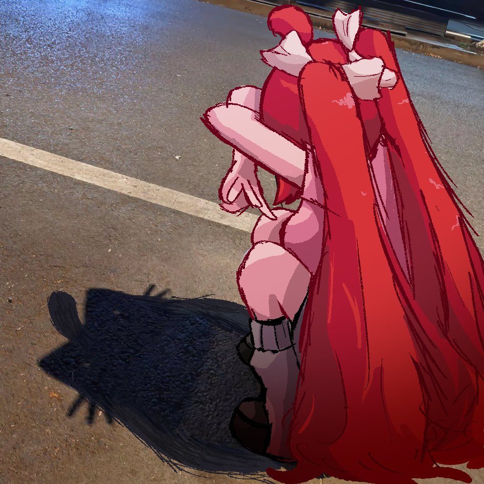 1girl ahoge bonbon_(bonzomcbonbon) bow brown_shoes cat_shadow_puppet_(meme) from_behind ketchup_(bonzomcbonbon) long_hair meme original outdoors photo_background pink_shirt red_hair shadow shirt shoes socks solo squatting twintails very_long_hair white_bow white_socks