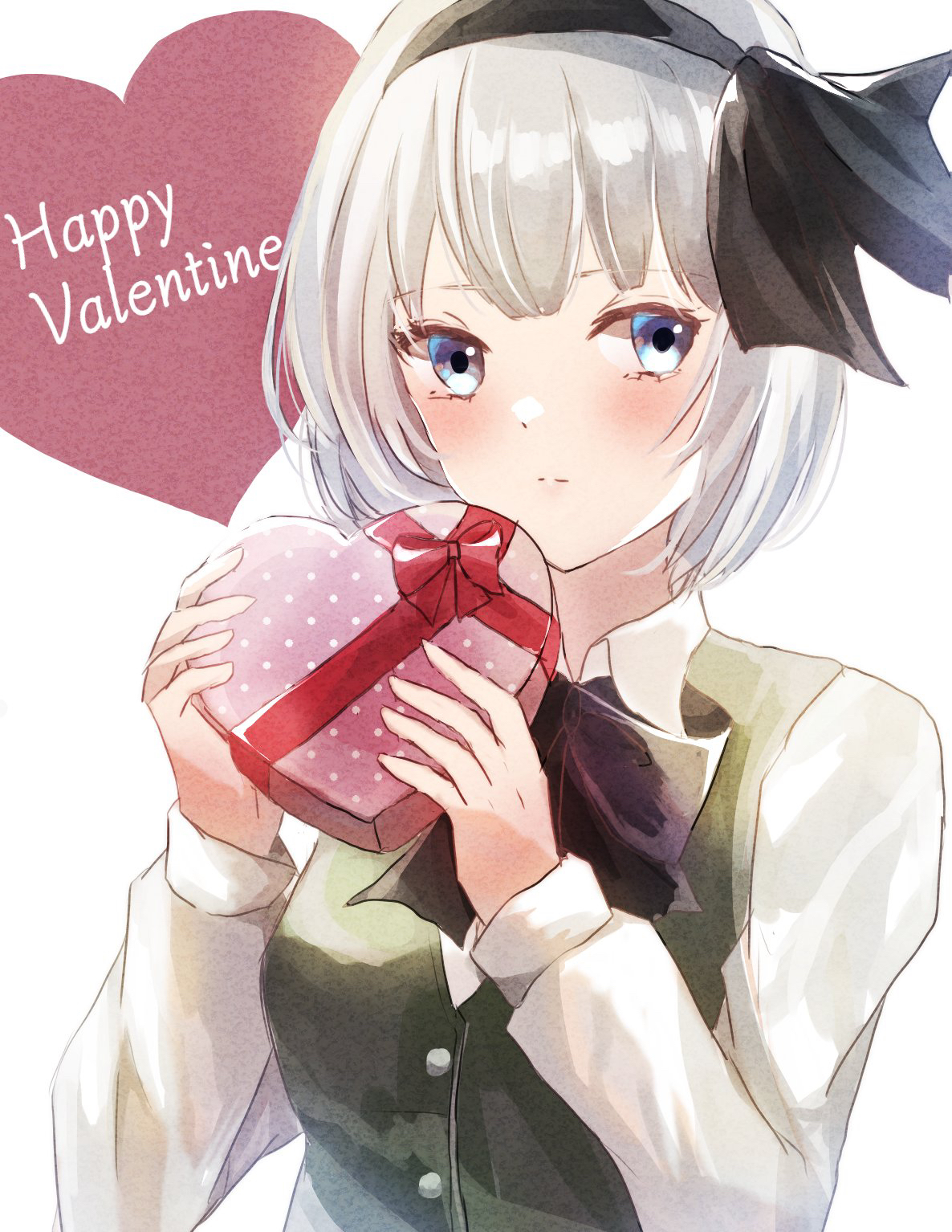 1girl aridamikannn black_bow black_bowtie black_hairband blue_eyes blush bow bowtie box closed_mouth collared_shirt commentary_request english_text green_vest grey_hair hairband happy_valentine heart-shaped_box highres konpaku_youmu long_sleeves looking_at_viewer shirt solo touhou valentine vest white_shirt