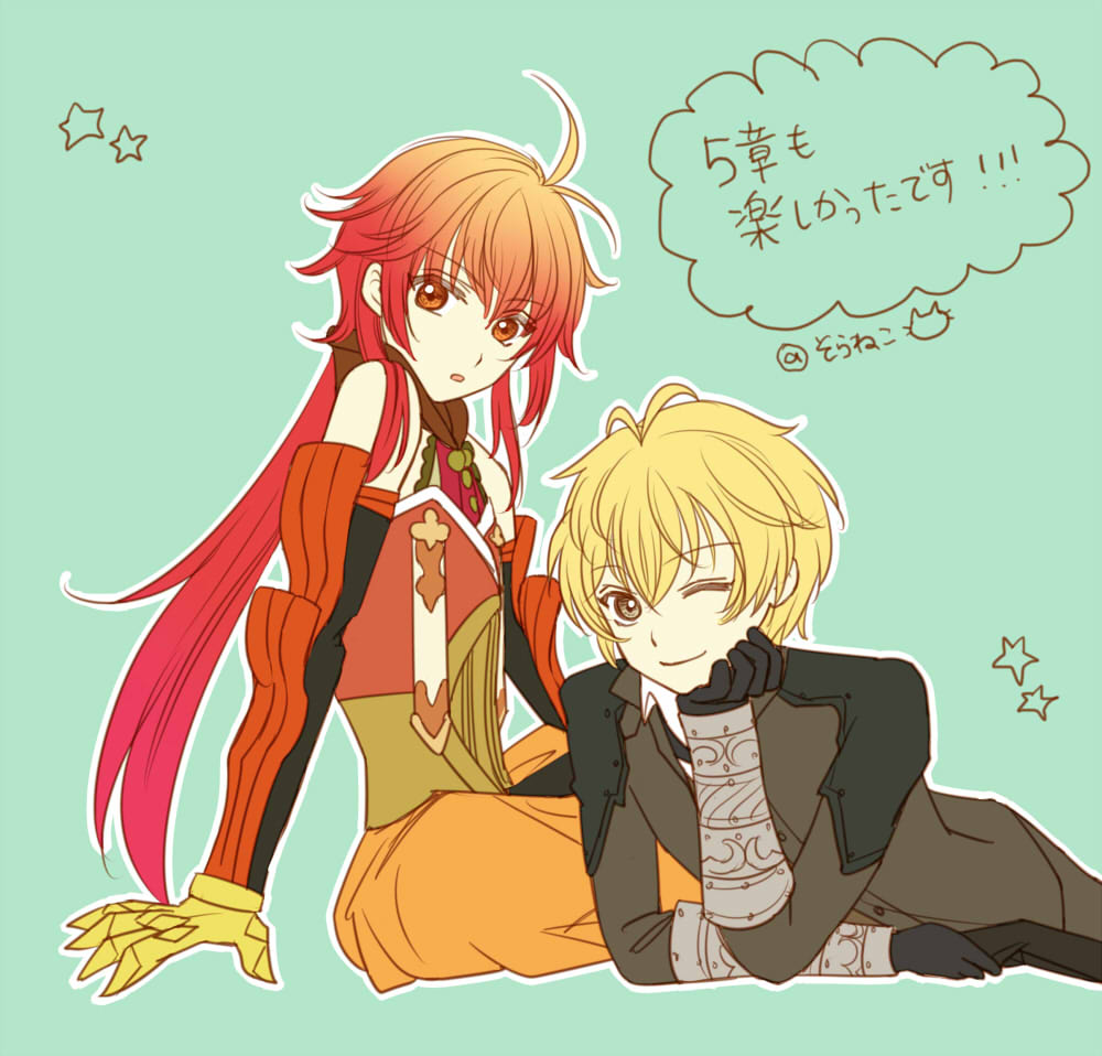 2boys blonde_hair character_request fate/grand_order fate_(series) gauntlets gradient_hair green_background long_hair male_focus multicolored_hair multiple_boys one_eye_closed orange_eyes orange_hair outline rama_(fate) red_eyes red_hair short_hair smile srnk star_(symbol) white_outline yellow_eyes