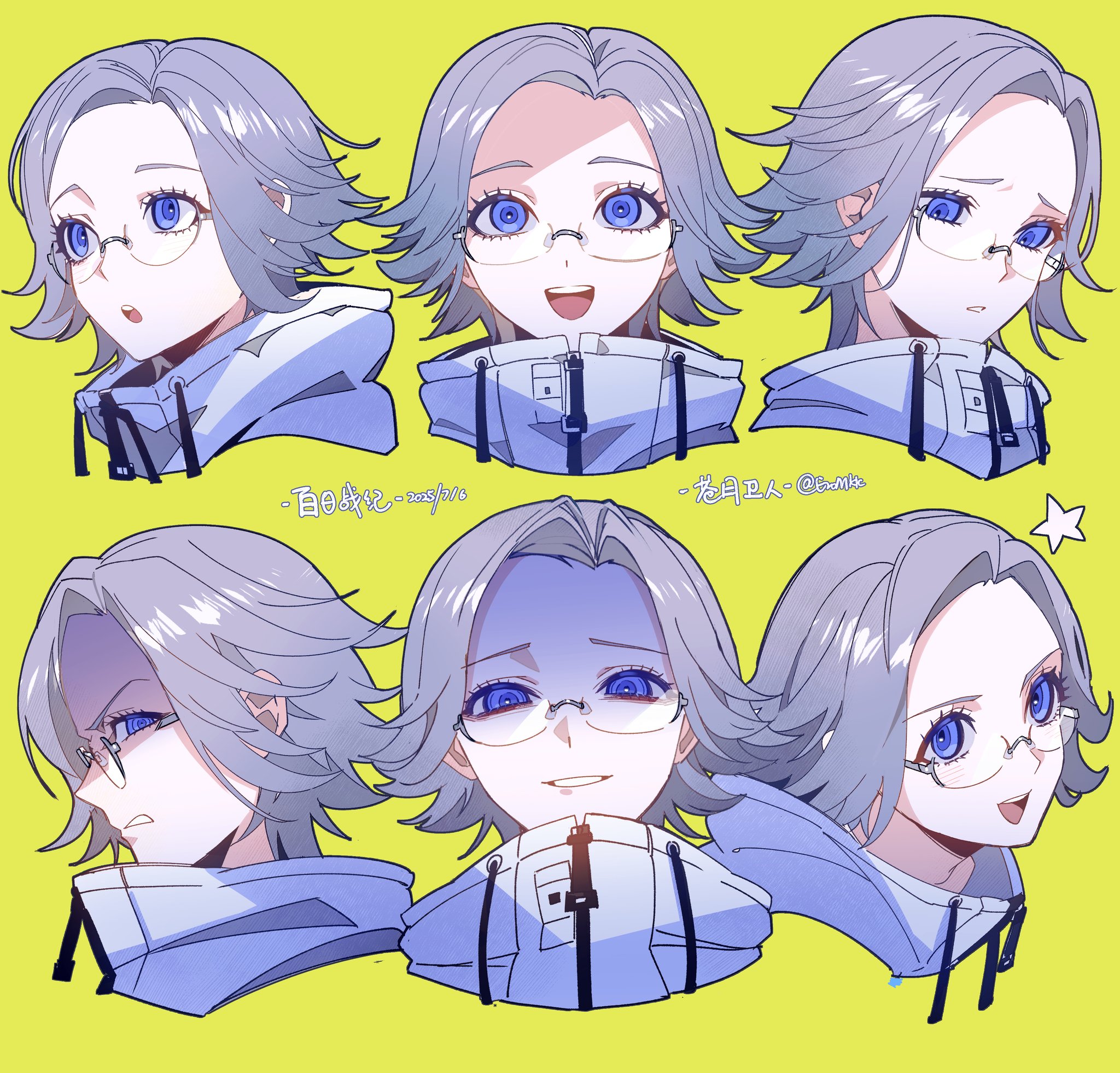 1boy :d :o aotsuki_eito cropped_shoulders dated eromkk evil_smile frown glasses grey_hair grimace highres jacket looking_at_viewer male_focus multiple_expressions multiple_views open_mouth purple_eyes shaded_face short_hair simple_background smile spoilers star_(symbol) the_hundred_line_-last_defense_academy- twitter_username yellow_background