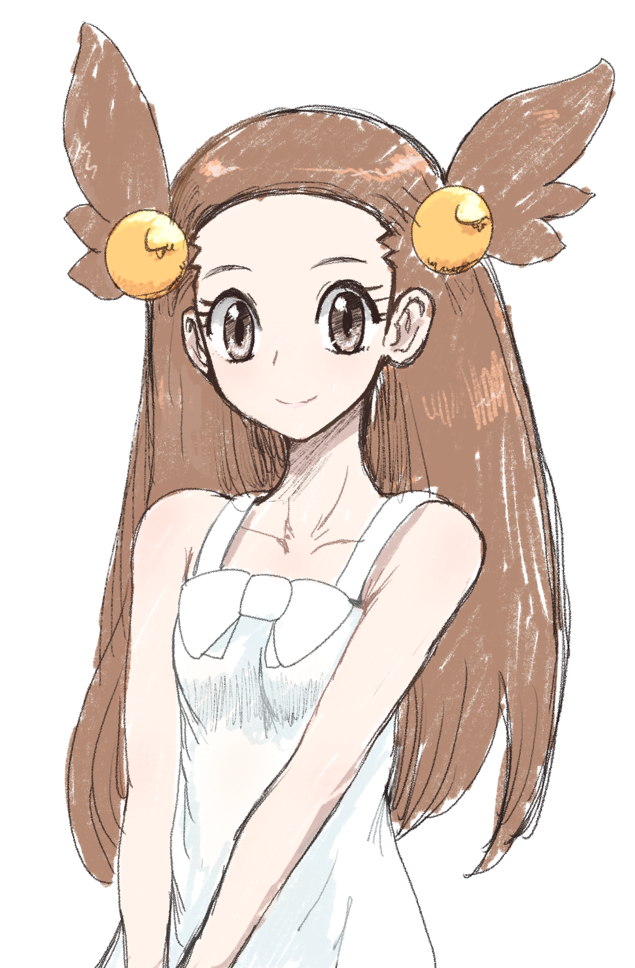 1girl bare_arms brown_eyes brown_hair collarbone commentary_request dress eyelashes hair_bobbles hair_ornament haloh happy highres jasmine_(pokemon) long_hair looking_at_viewer nintendo pokemon pokemon_gold/silver/crystal simple_background sleeveless sleeveless_dress solo two_side_up upper_body white_background white_dress