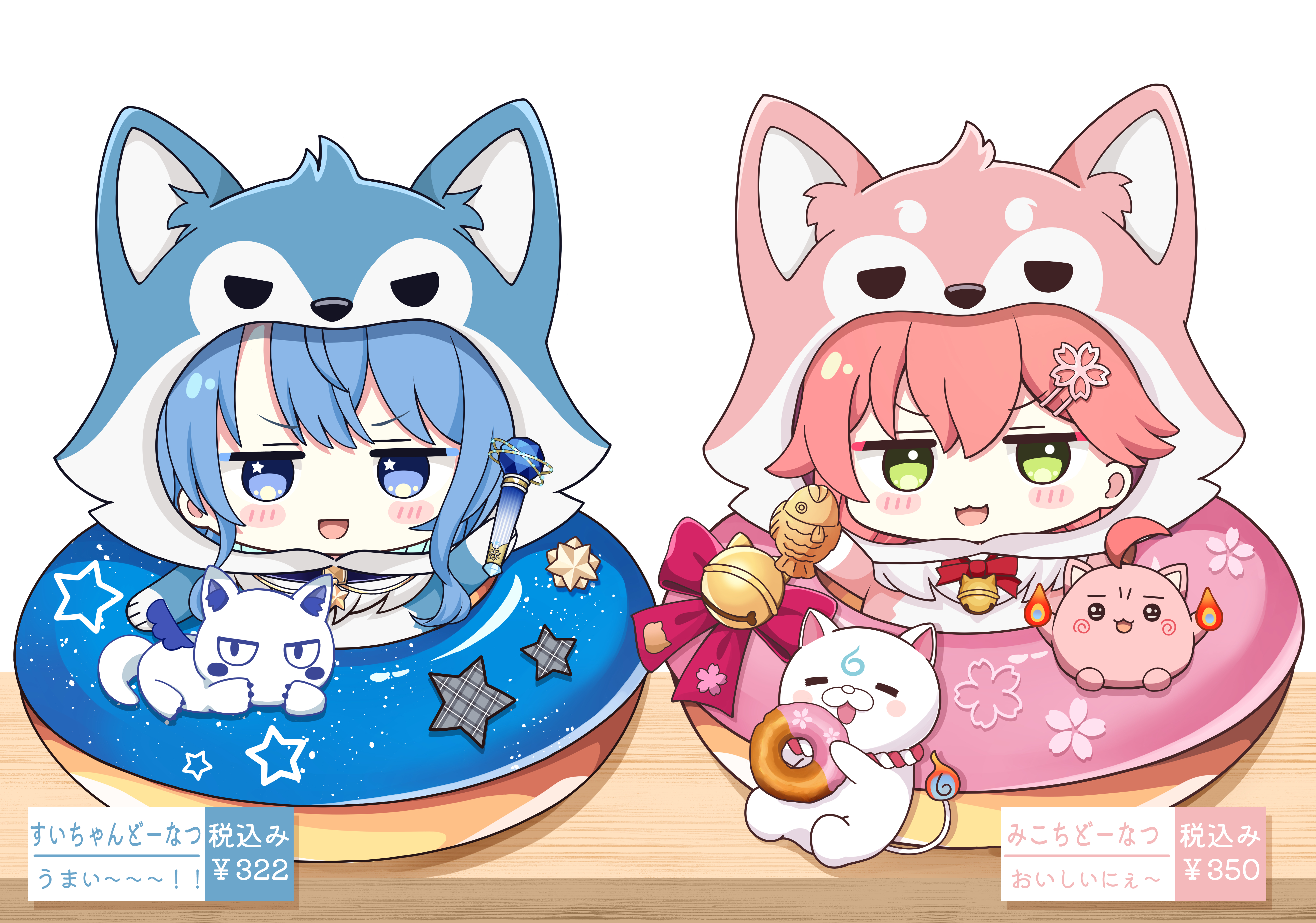 2girls 35p_(sakura_miko) :3 absurdres ahoge animal_costume animal_hood bell blue_eyes blue_hair blush_stickers cat chibi chibi_only commentary_request creature donut fire flame-tipped_tail floral_print flower food green_eyes hair_flower hair_ornament hand_up highres holding holding_food holding_microphone hololive hood hoshimachi_suisei jingle_bell kyabetsu_ningen long_sidelocks looking_at_viewer maguchi_(sakura_miko) microphone multiple_girls on_table open_mouth oversized_food oversized_object pink_hair ribbon sakura_miko sidelocks simple_background smile star_(symbol) star_in_eye symbol_in_eye table tail taiyaki takoyaki_(hoshimachi_suisei) translation_request virtual_youtuber wagashi white_background wings