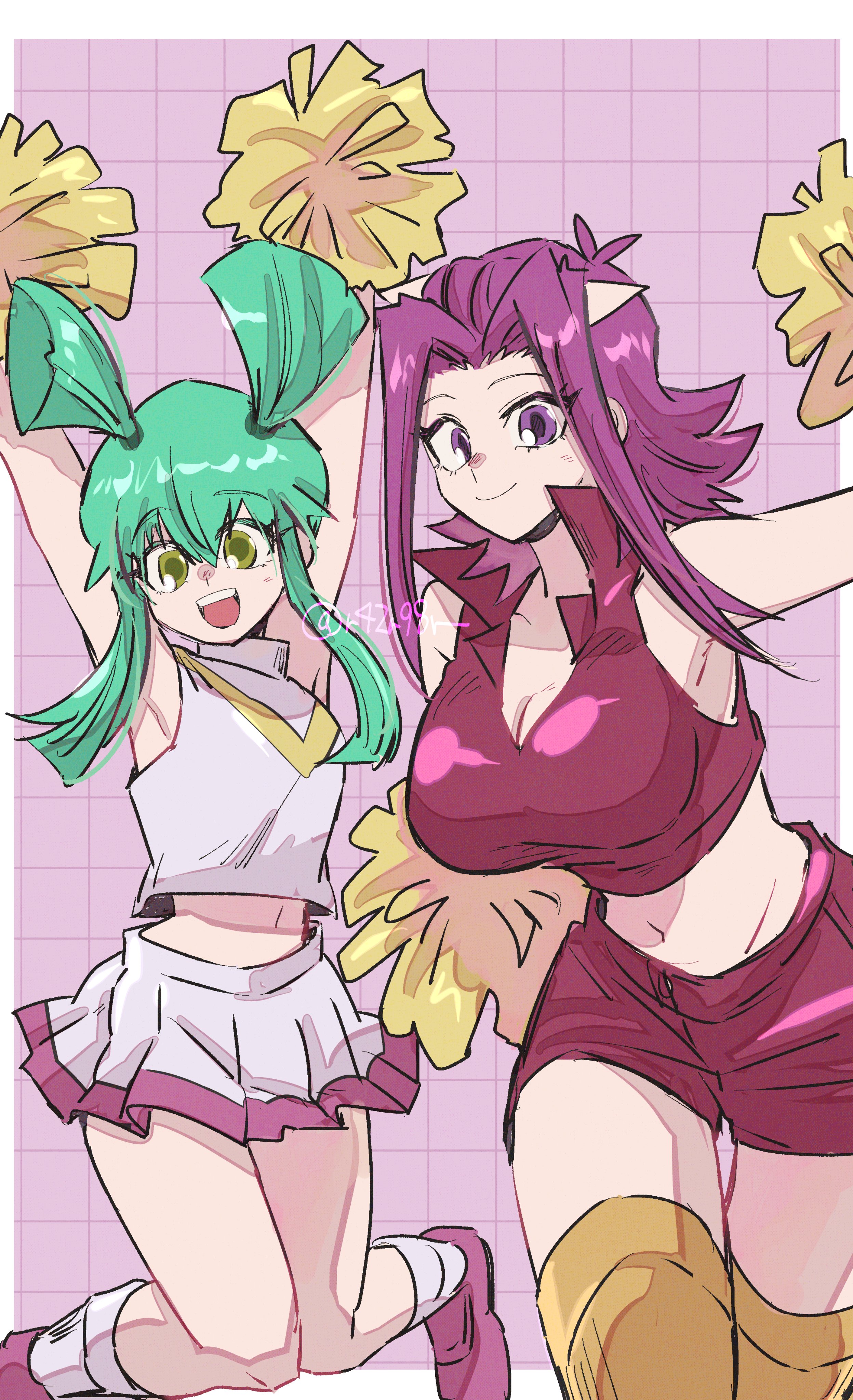 2girls absurdres artist_name bare_shoulders bibiri_(r42r98r) breasts cheerleader collarbone flat_chest green_eyes green_hair happy highres izayoi_aki large_breasts luca_(yu-gi-oh!) medium_hair multiple_girls official_alternate_costume open_mouth pom_pom_(cheerleading) purple_eyes purple_hair smile thighhighs twitter_username yu-gi-oh! yu-gi-oh!_5d's