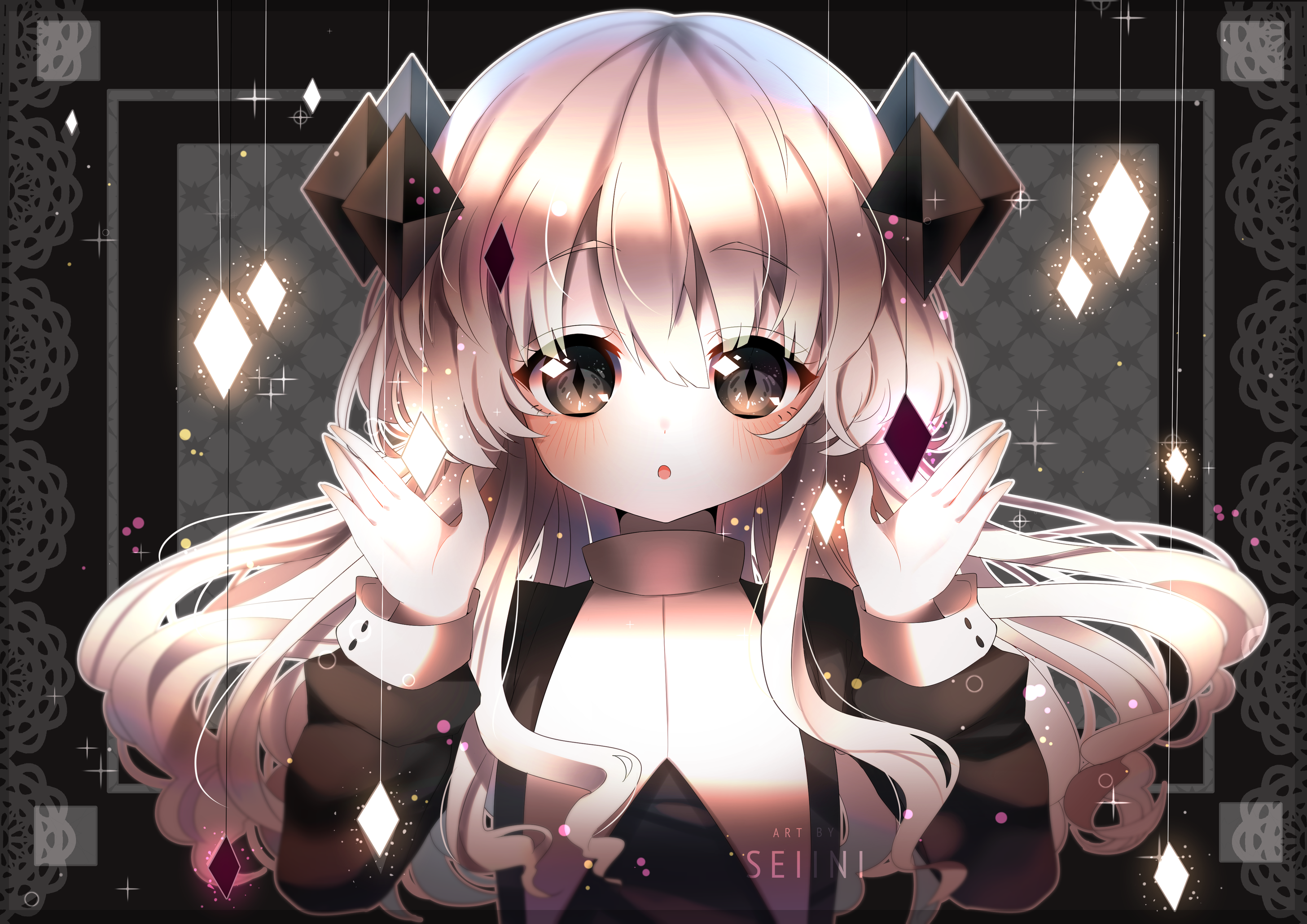 1girl :o black_dress black_eyes blush buttons colored_skin crystal_hair deviantart_username dress funamusea hands_up highres light_particles long_hair looking_at_viewer open_mouth seiini sidelocks silhouette_(funamusea) solo sparkle straight-on upper_body watermark white_hair white_skin