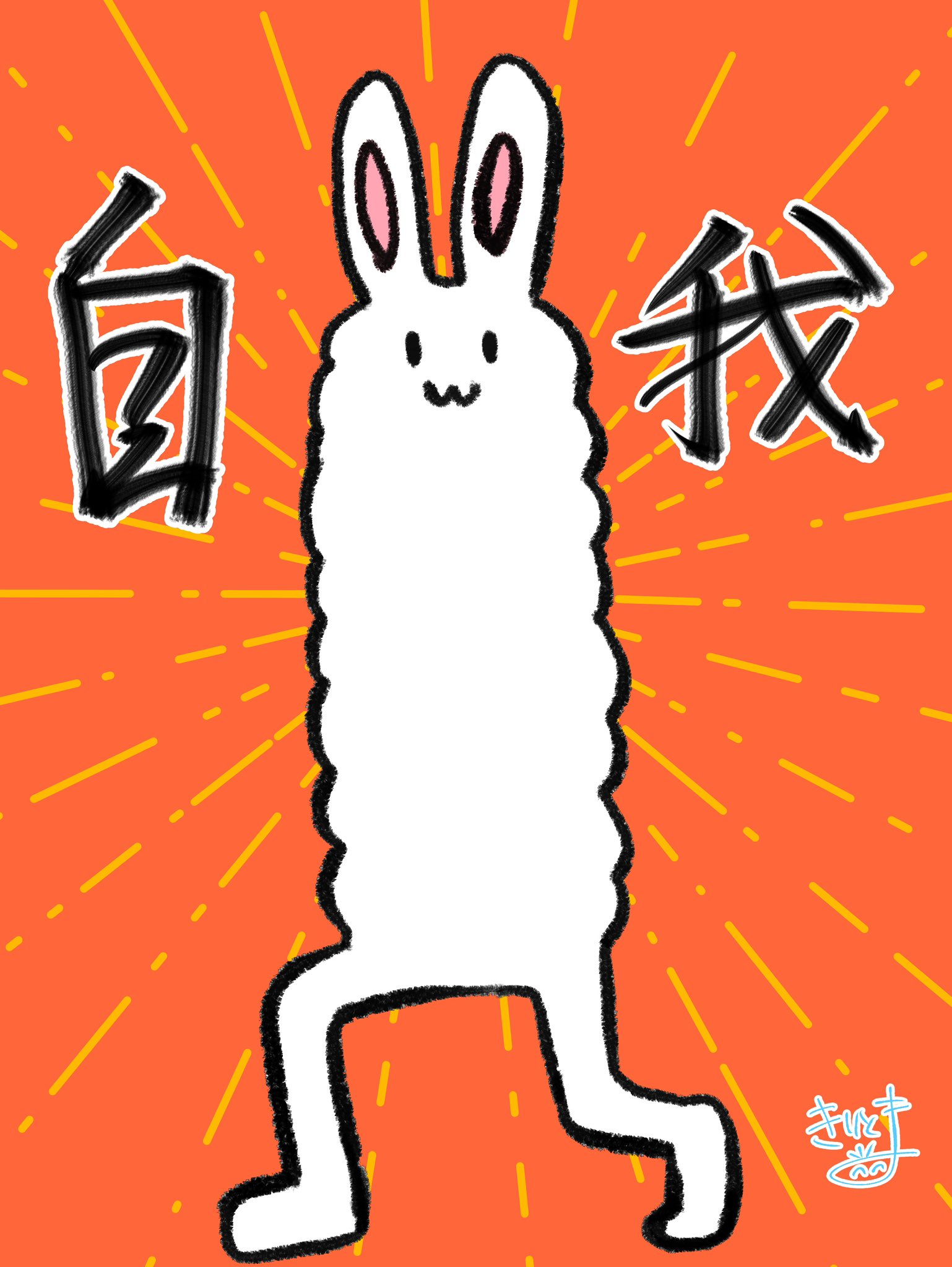 :3 closed_mouth don-chan_(usada_pekora) full_body highres hololive kiritoma looking_at_viewer no_humans orange_background standing translation_request virtual_youtuber |_|