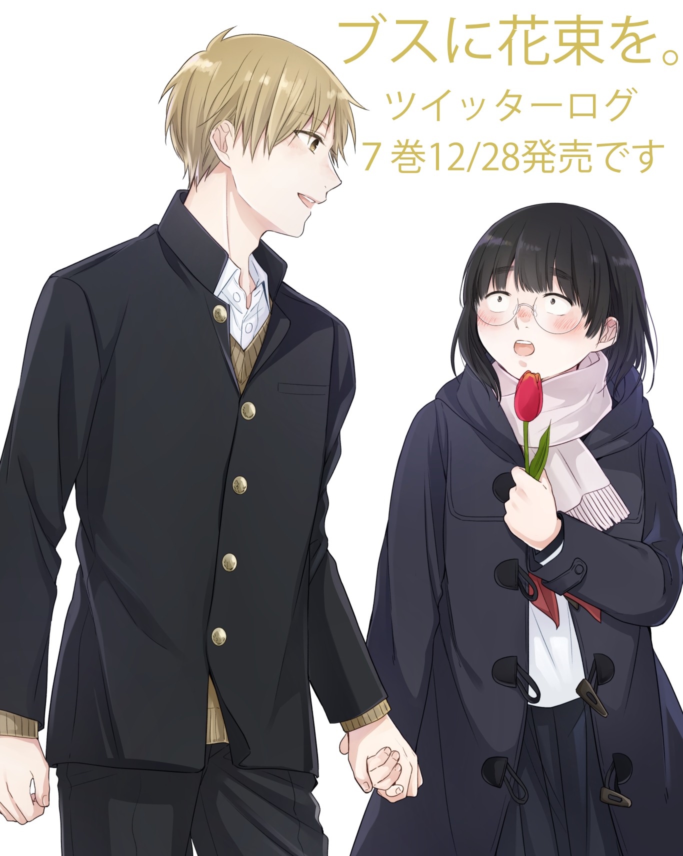 1boy 1girl :o black_coat blonde_hair blush busu_ni_hanataba_wo. coat dated flower gakuran glasses hetero highres holding_hands open_clothes open_coat sakura_roku scarf school_uniform short_hair standing tabata_hana tulip ueno_yousuke