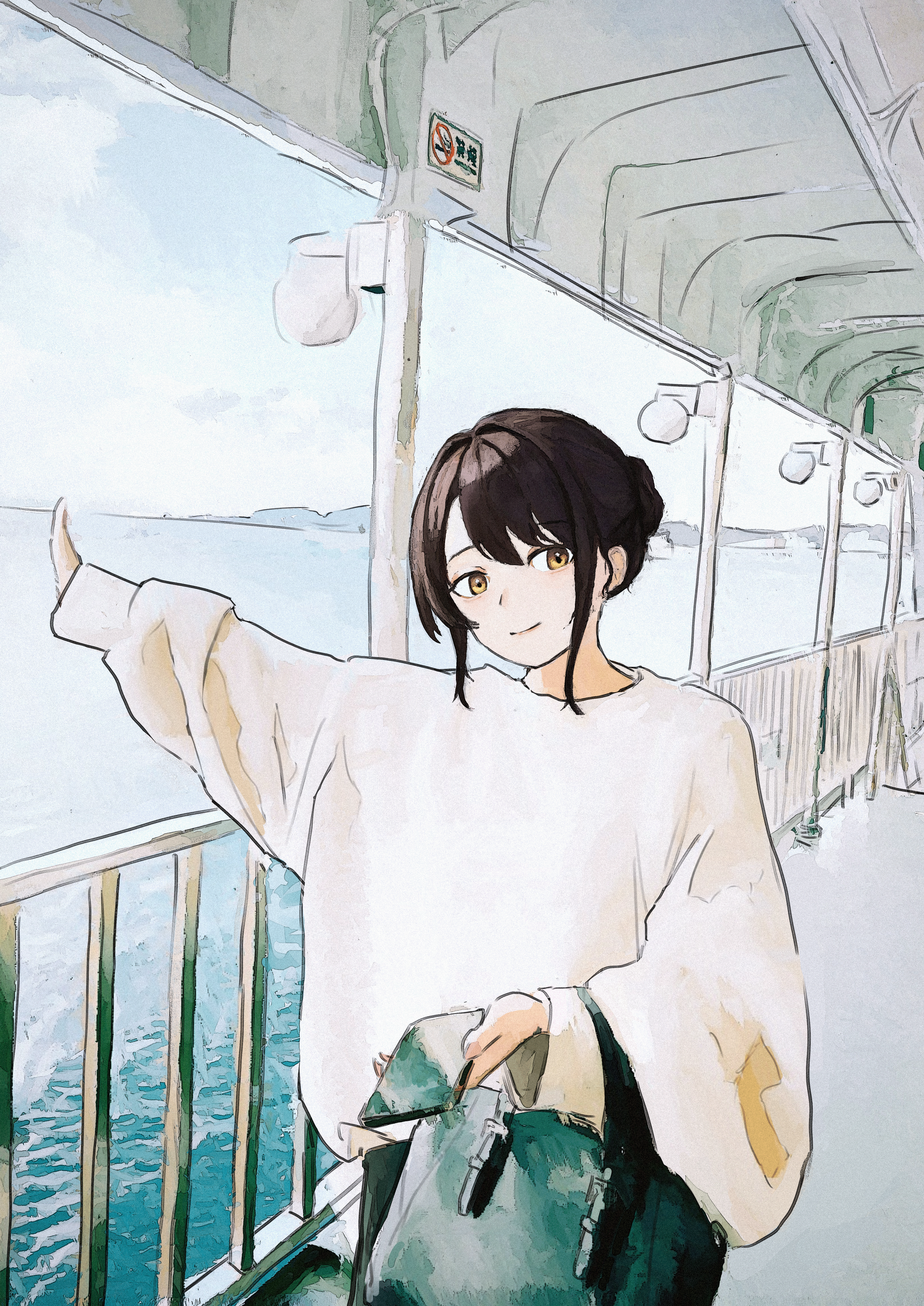 1girl absurdres bag black_bag black_hair cellphone closed_mouth commentary_request cowboy_shot day fence hair_bun hair_intakes handbag highres holding holding_bag holding_phone iron_fence long_sleeves looking_at_viewer ocean on_ship orange_eyes original outstretched_arm parted_bangs phone ponta_(matsuokazieg) scenery shore sidelocks sign single_hair_bun sky smartphone smile solo standing sweater wall_lamp water white_sweater wide_sleeves