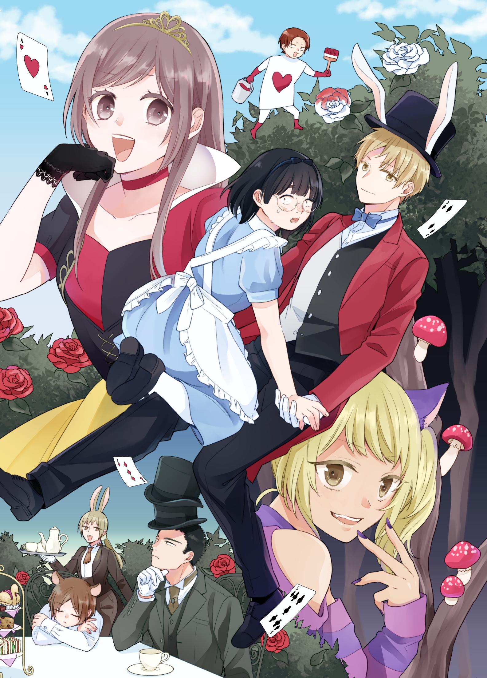 3girls 5boys :d alice's_adventures_in_wonderland alice_(alice_in_wonderland) alice_(alice_in_wonderland)_(cosplay) apron ascot black_hair black_pants black_shoes black_suit blonde_hair blue_dress brown_eyes brown_hair busu_ni_hanataba_wo. card_soldier character_request cosplay crossed_arms dress formal_clothes gloves gotanda_tetsuo grey_suit highres holding holding_hands holding_tray multiple_boys multiple_girls mushroom open_mouth painting_(action) pants red_shirt sakura_roku shinbashi_tsutomu shirt shoes smile suit tabata_hana tiered_tray tray tree two-tone_vest ueno_yousuke uguisudani_sumire white_gloves