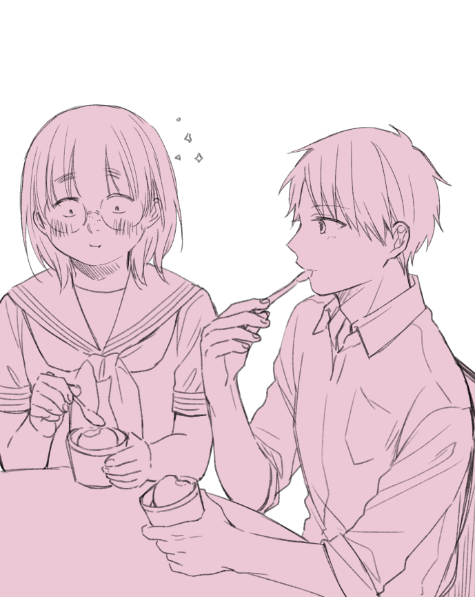 1boy 1girl busu_ni_hanataba_wo. eating monochrome neckerchief pink_theme sakura_roku school_uniform serafuku short_sleeves simple_background sitting spoon tabata_hana ueno_yousuke white_background