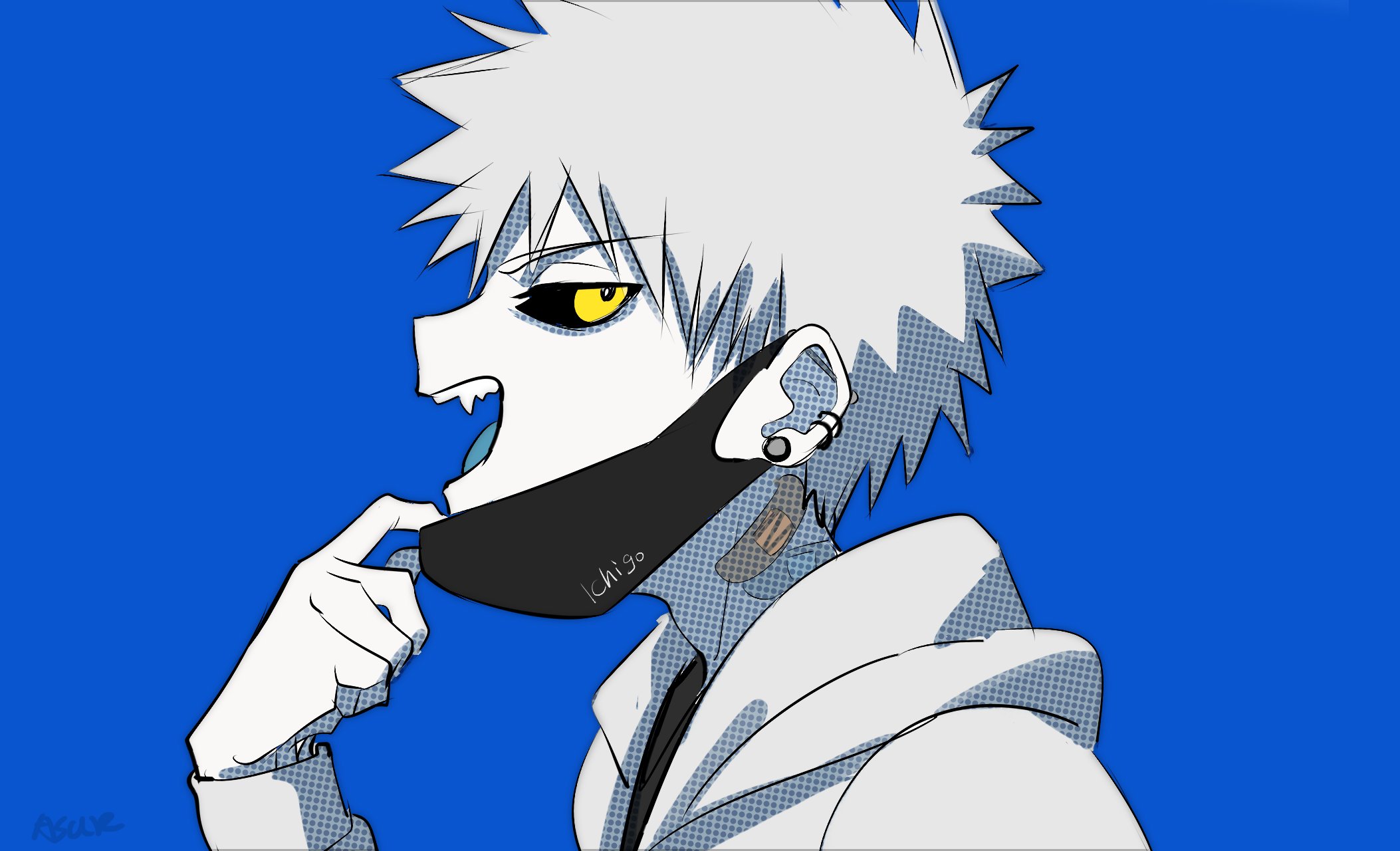 1boy asure_(asure_twi) bandaid bandaid_on_neck black_sclera bleach blue_background blue_tongue colored_sclera colored_tongue earrings fangs highres hollow_ichigo hood hood_down hooded_jacket jacket jewelry looking_at_viewer male_focus mask_pull parody short_hair solo upper_body vampire_(vocaloid) white_hair white_jacket yellow_eyes