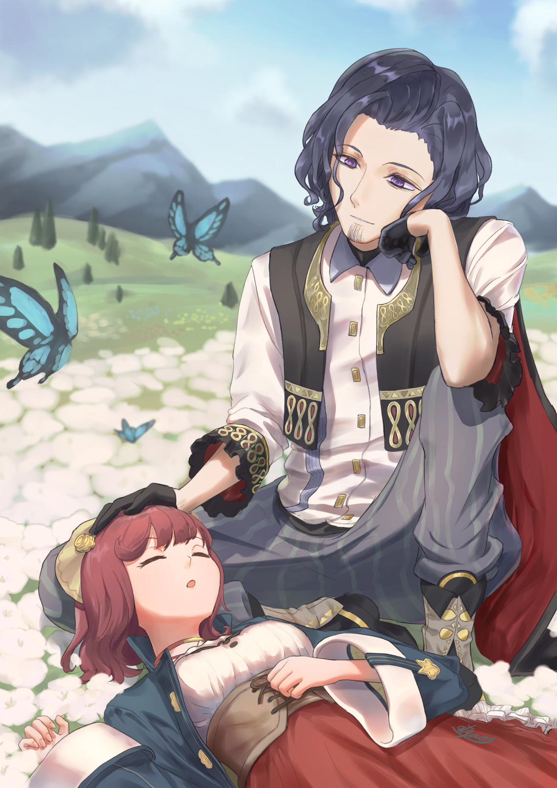 1boy 1girl atelier_(series) atelier_sophie atyao-299 black_gloves bug butterfly flower gloves harol_simens highres insect lap_pillow looking_at_another purple_eyes red_hair sleeping sophie_neuenmuller white_flower