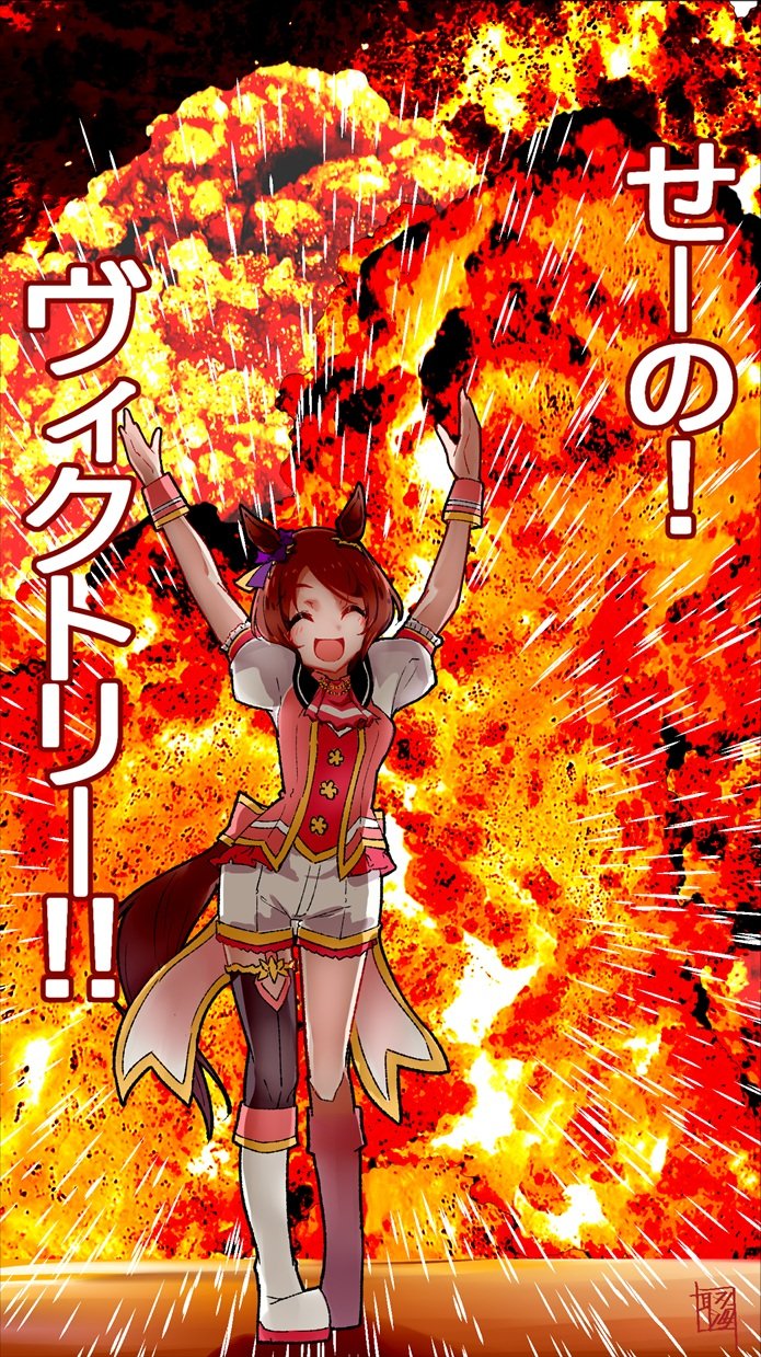 1girl animal_ears arms_up blush boots brown_hair closed_eyes commentary_request emphasis_lines explosion full_body highres horse_ears horse_girl horse_tail open_mouth sakura_laurel_(saisir_le_reve)_(umamusume) sakura_laurel_(umamusume) standing tail torikai_a translation_request umamusume